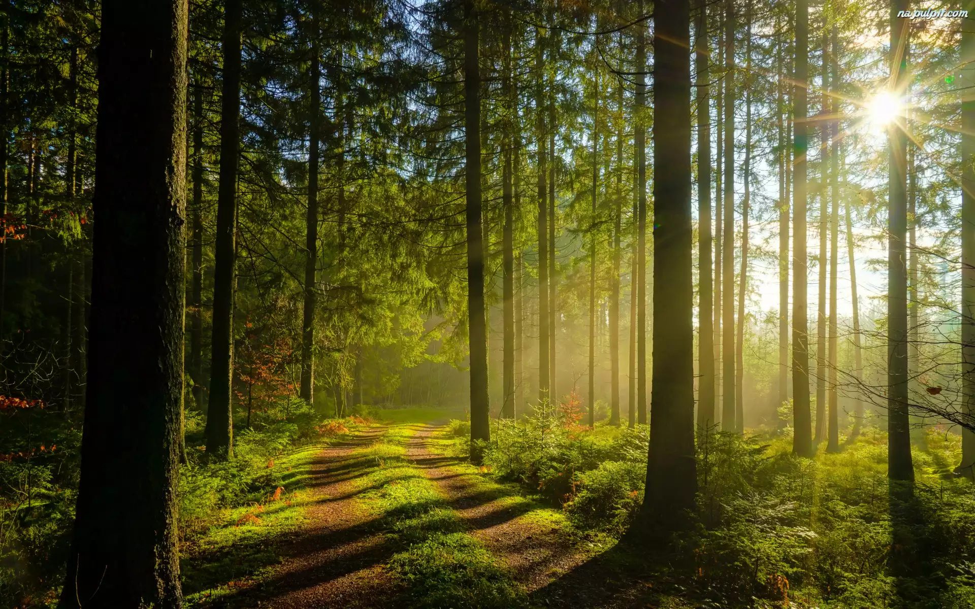 Zieleń, Las, Ścieżka, Mgła, Drzewa, Promienie słońca Na Pulpit