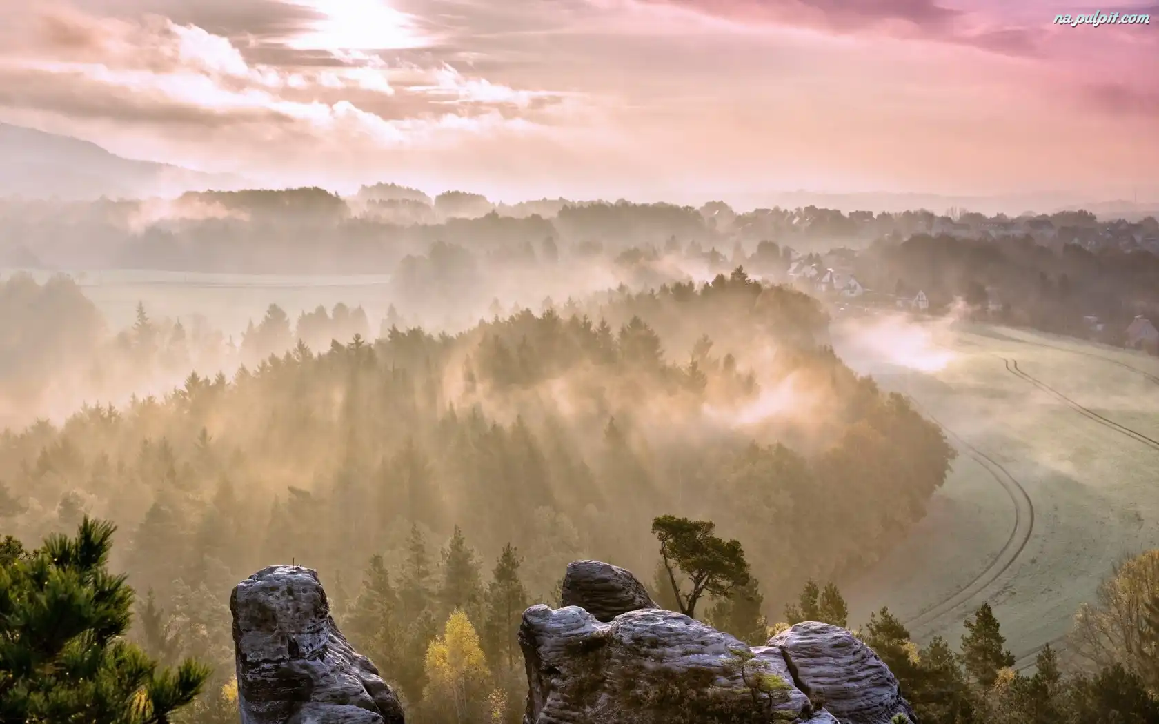 Mgła, Drzewa, Skały, Las Na Pulpit
