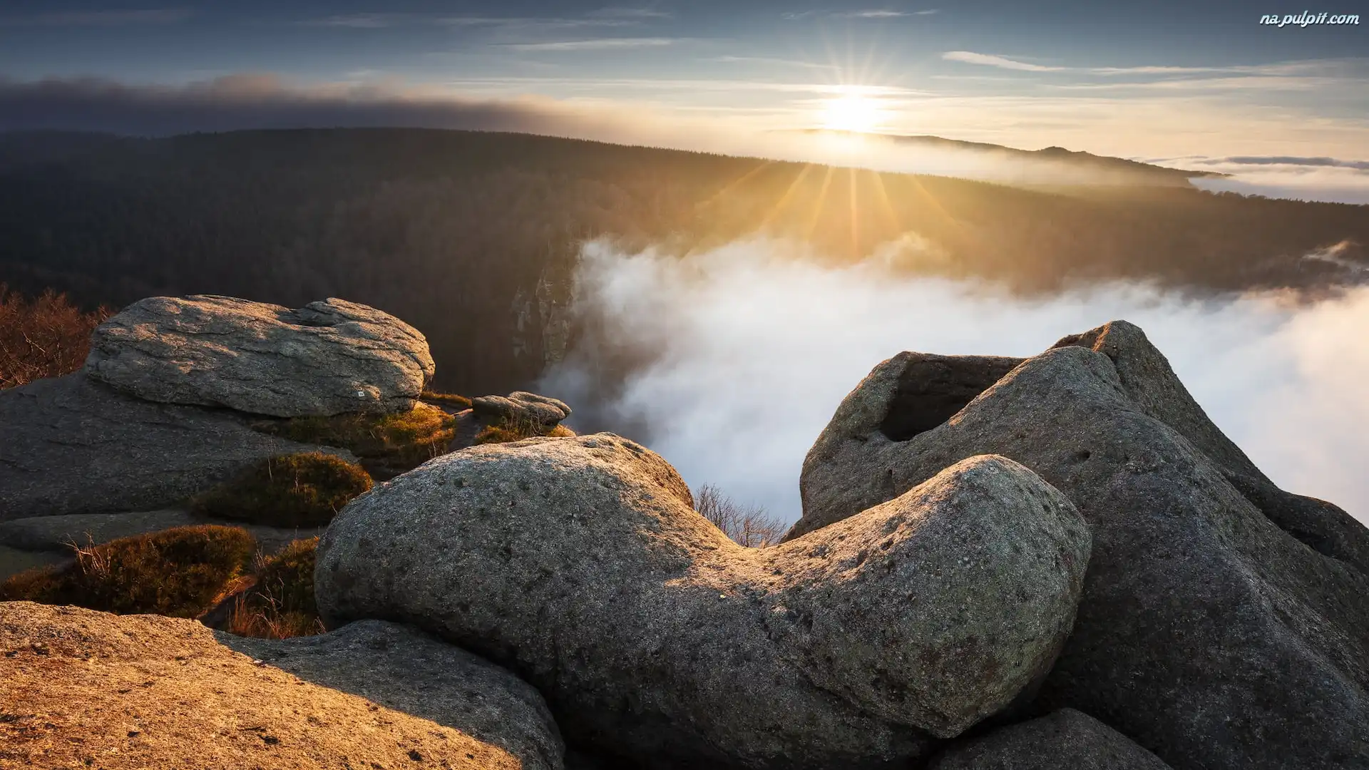 Mgła, Skały, Góry, Promienie słońca, Głazy Na Pulpit