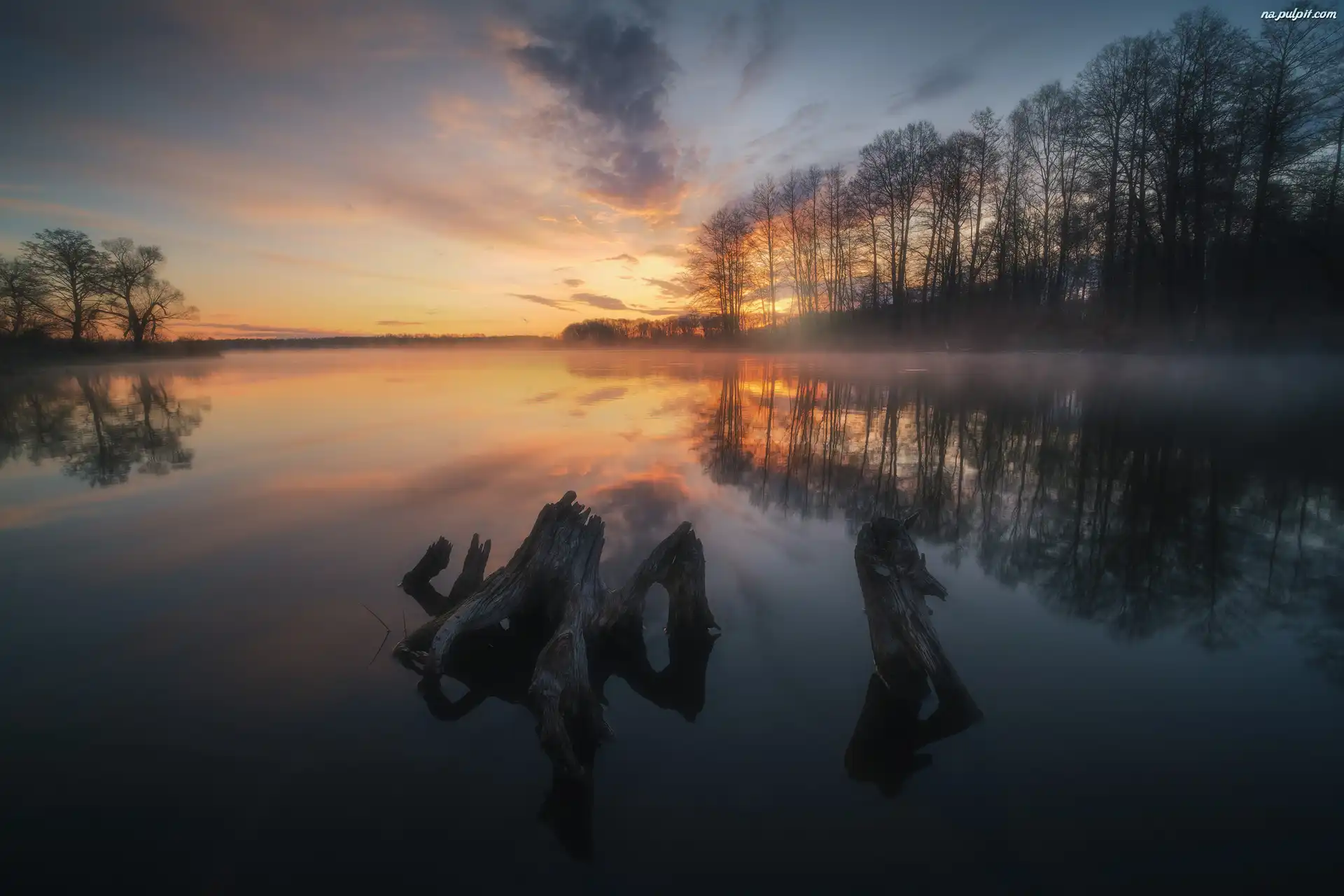 Mgła, Drzewa, Konary, Jezioro, Zachód słońca Na Pulpit