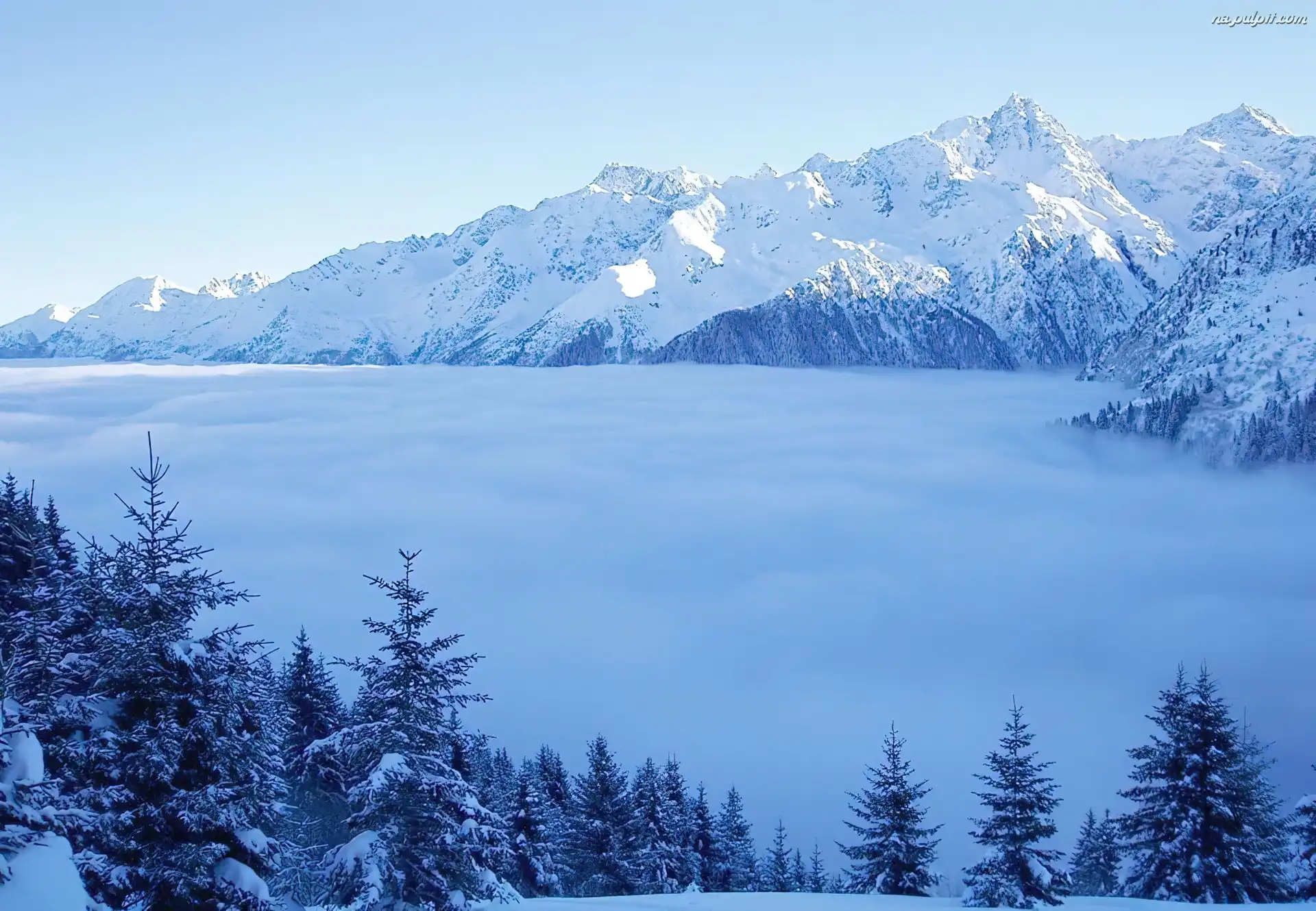 Mgła, Góry, Choinki, Zima, Śnieg Na Pulpit