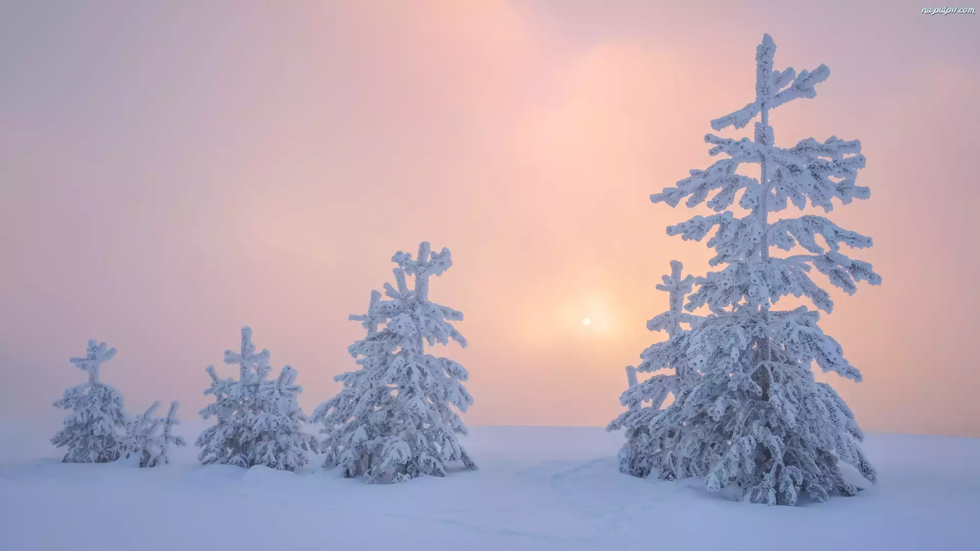 Zima, Ośnieżone, Drzewa, Mgła Na Pulpit