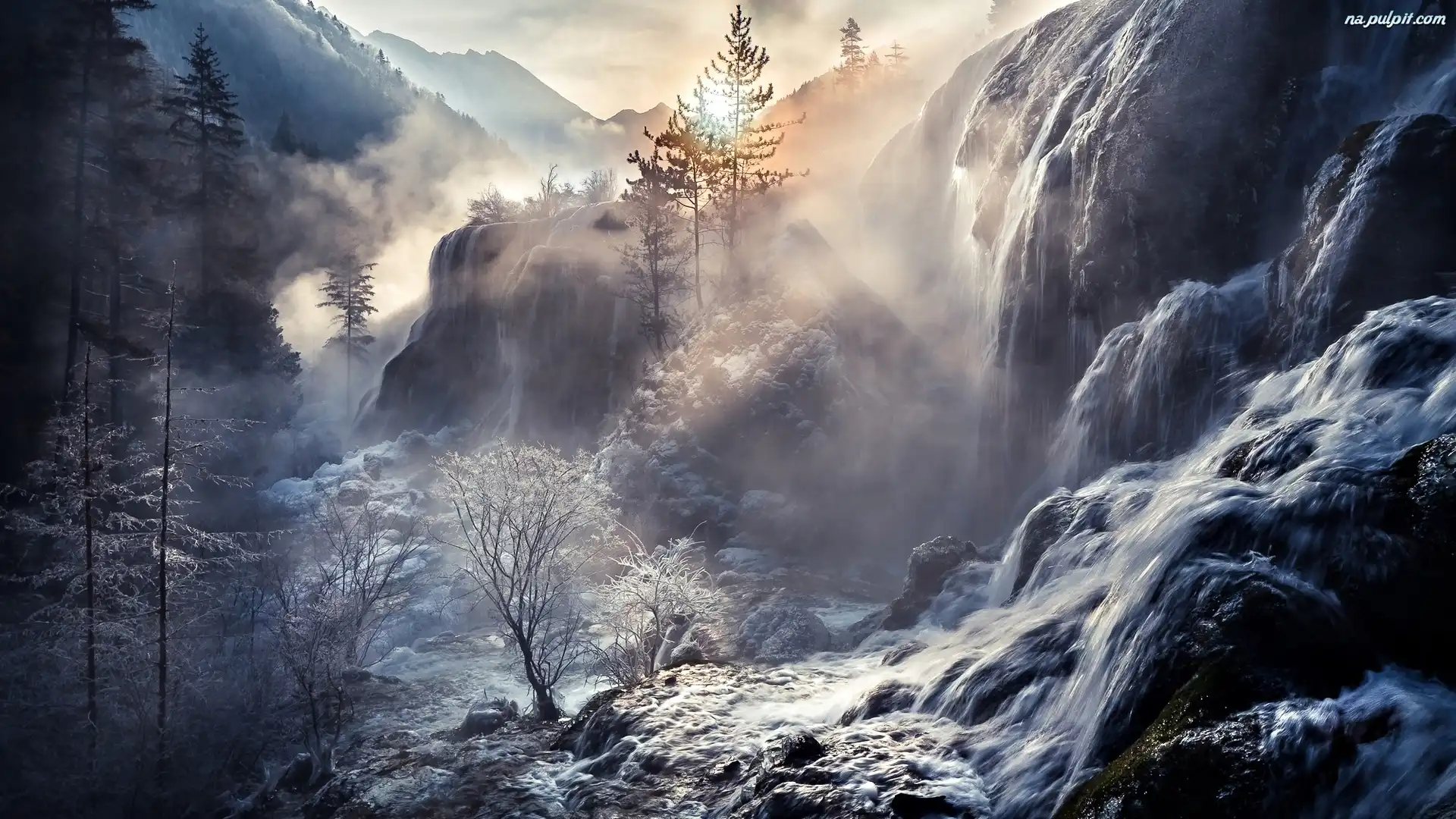 Mgła, Góry, Wschód słońca, Zima, Wodospad Na Pulpit