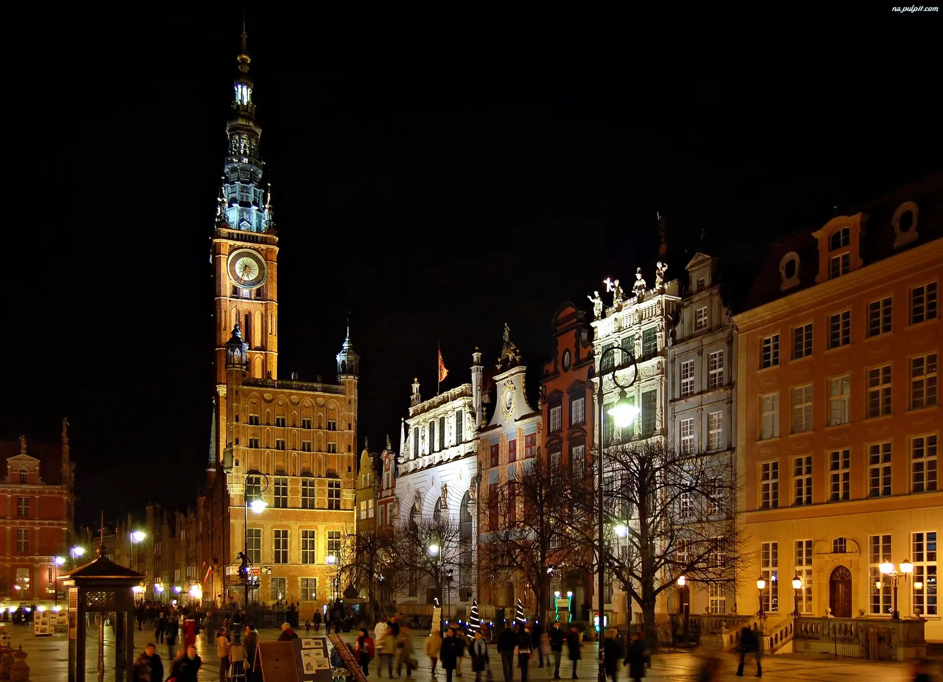 Nocą, Domy, Ratusz, Gdańsk, Polska, Fragment, Długi Targ, Miasta Na Pulpit
