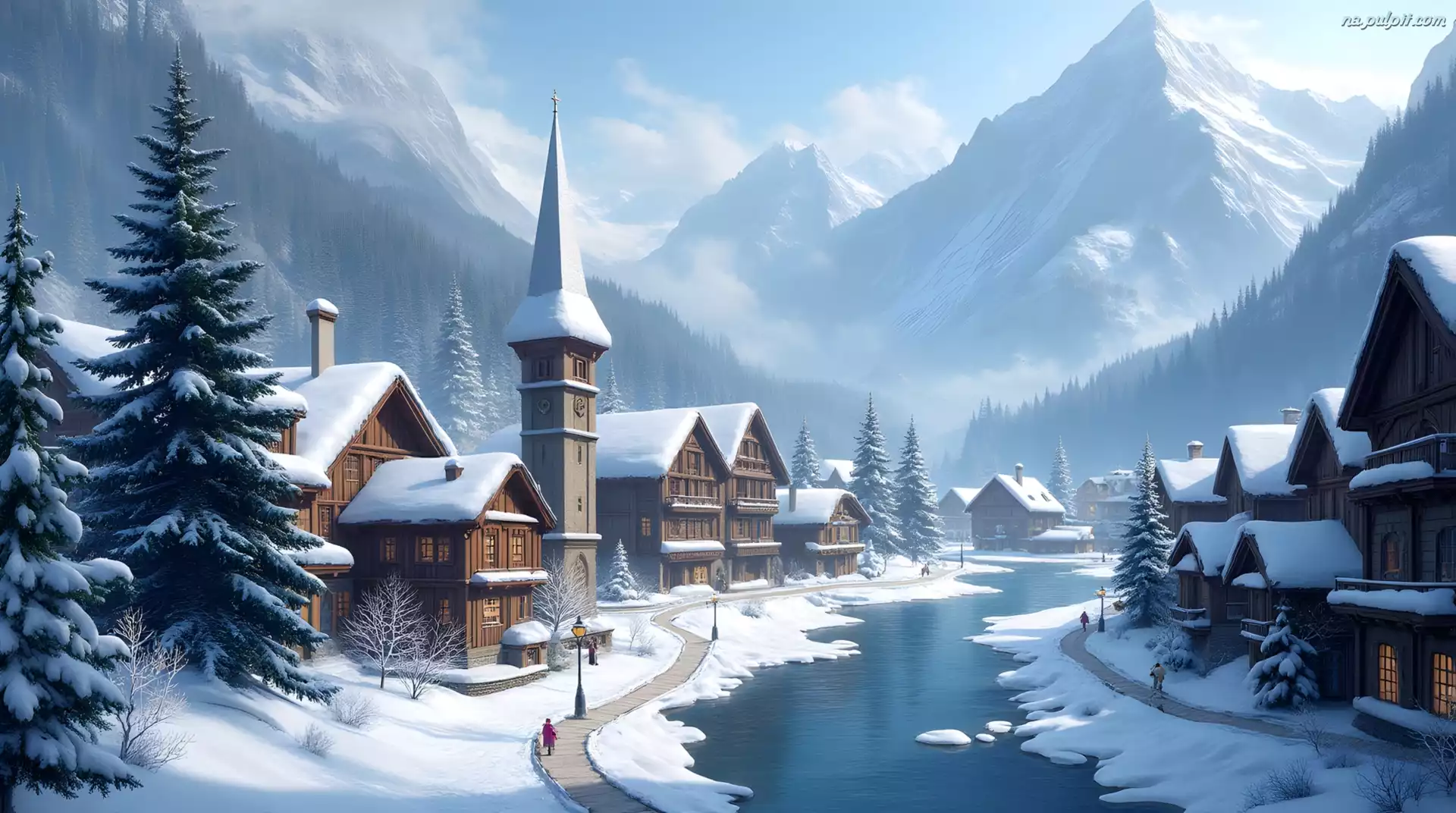 Rzeka, Zima, Kościół, Miasteczko, Domy, Góry Na Pulpit
