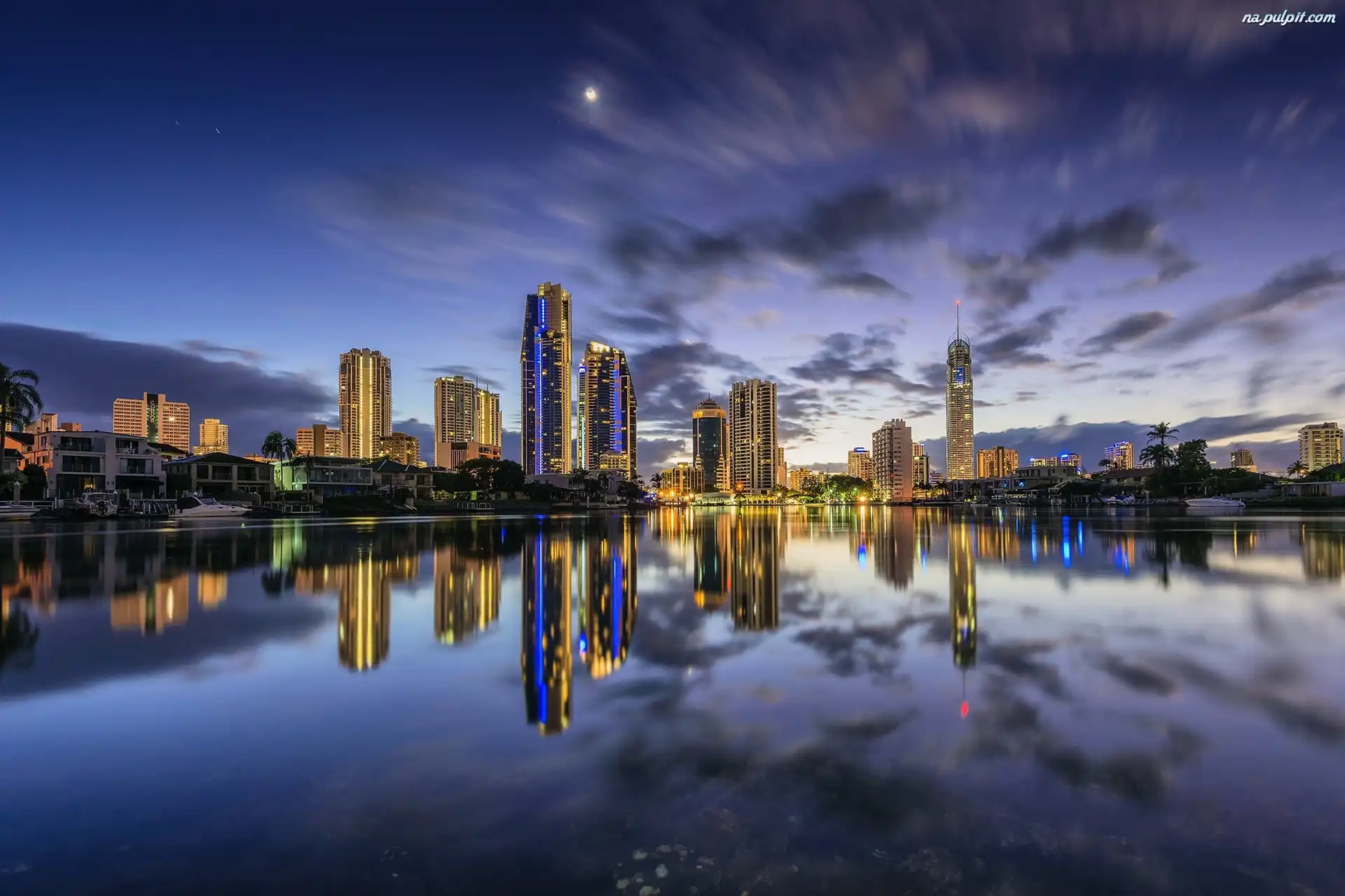 Miasto noca, Niebo, Drapacze Chmur, Rzeka