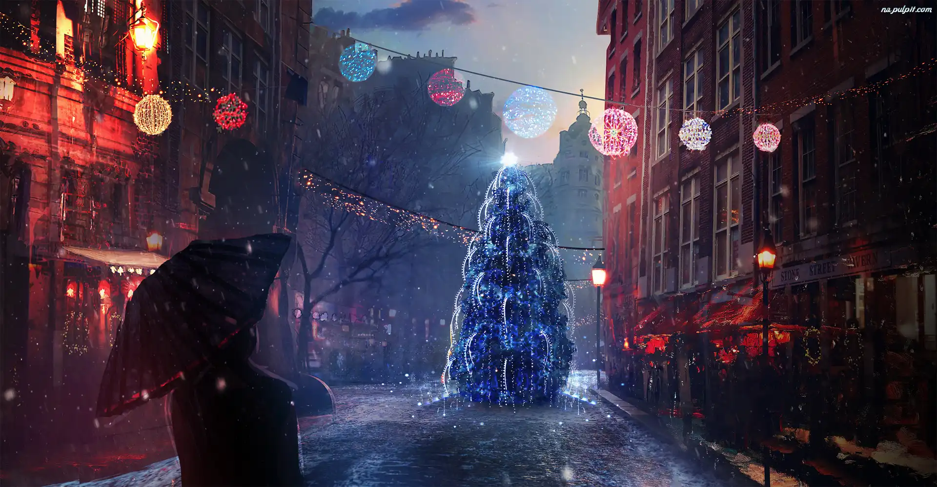 Miasto, Choinka, Dekoracje, Noc, Grafika, Święta Na Pulpit