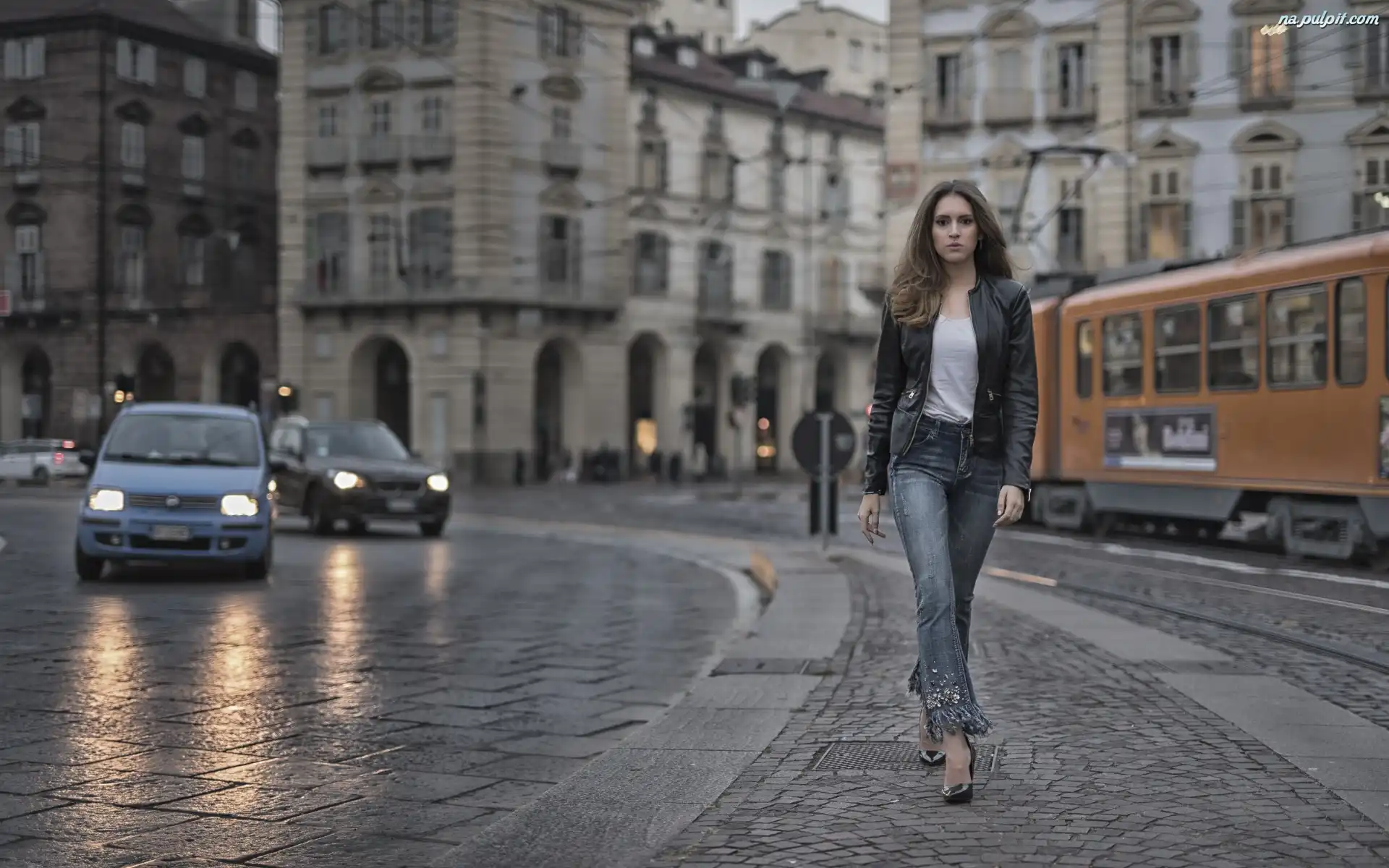 Miasto, Tramwaj, Droga, Domy, Kobieta, Samochody