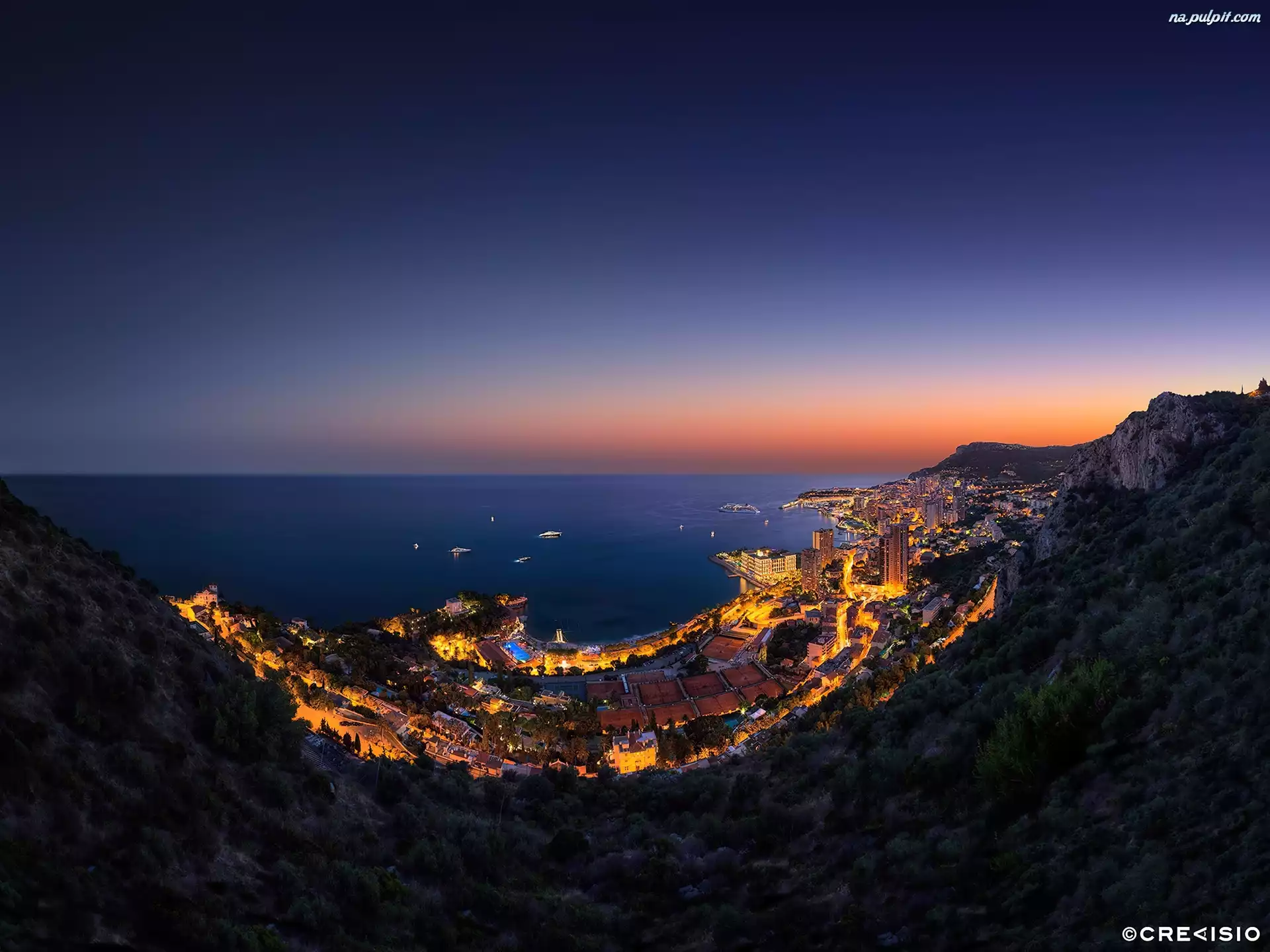 Miasto, Noc, Monako, Oświetlone Na Pulpit