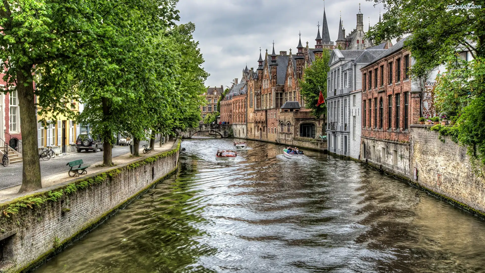 Ulica, Miasto, Domy, Drzewa, Ławka, Kanał, Belgia, Rzeka Na Pulpit