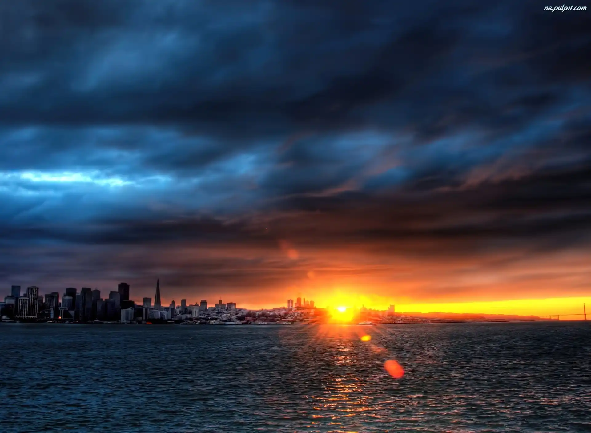 Miasto, Chmury, Zachód Słońca, Morze Na Pulpit