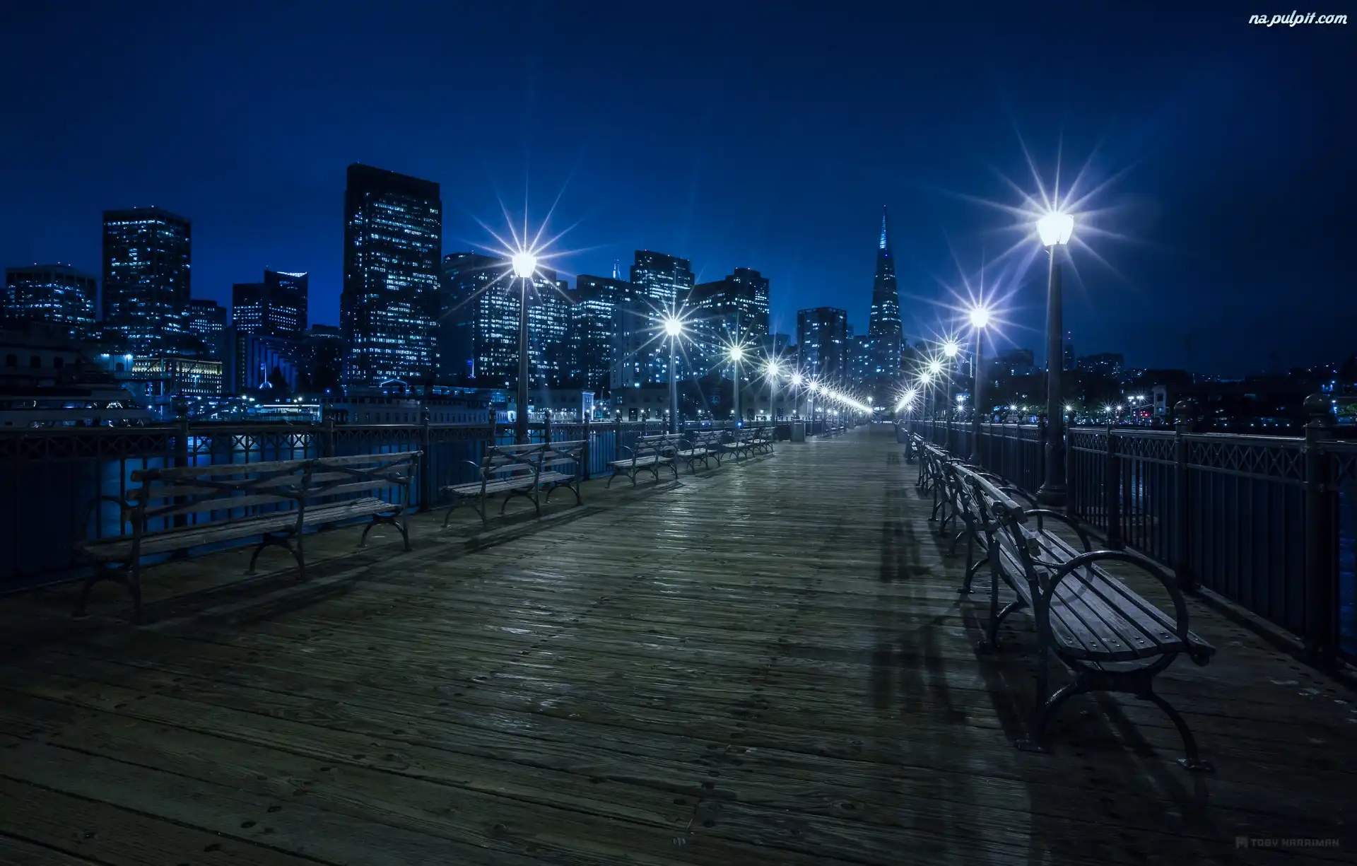Miasto nocą, Molo, Latarnie, Wieżowce, Ławki Na Pulpit