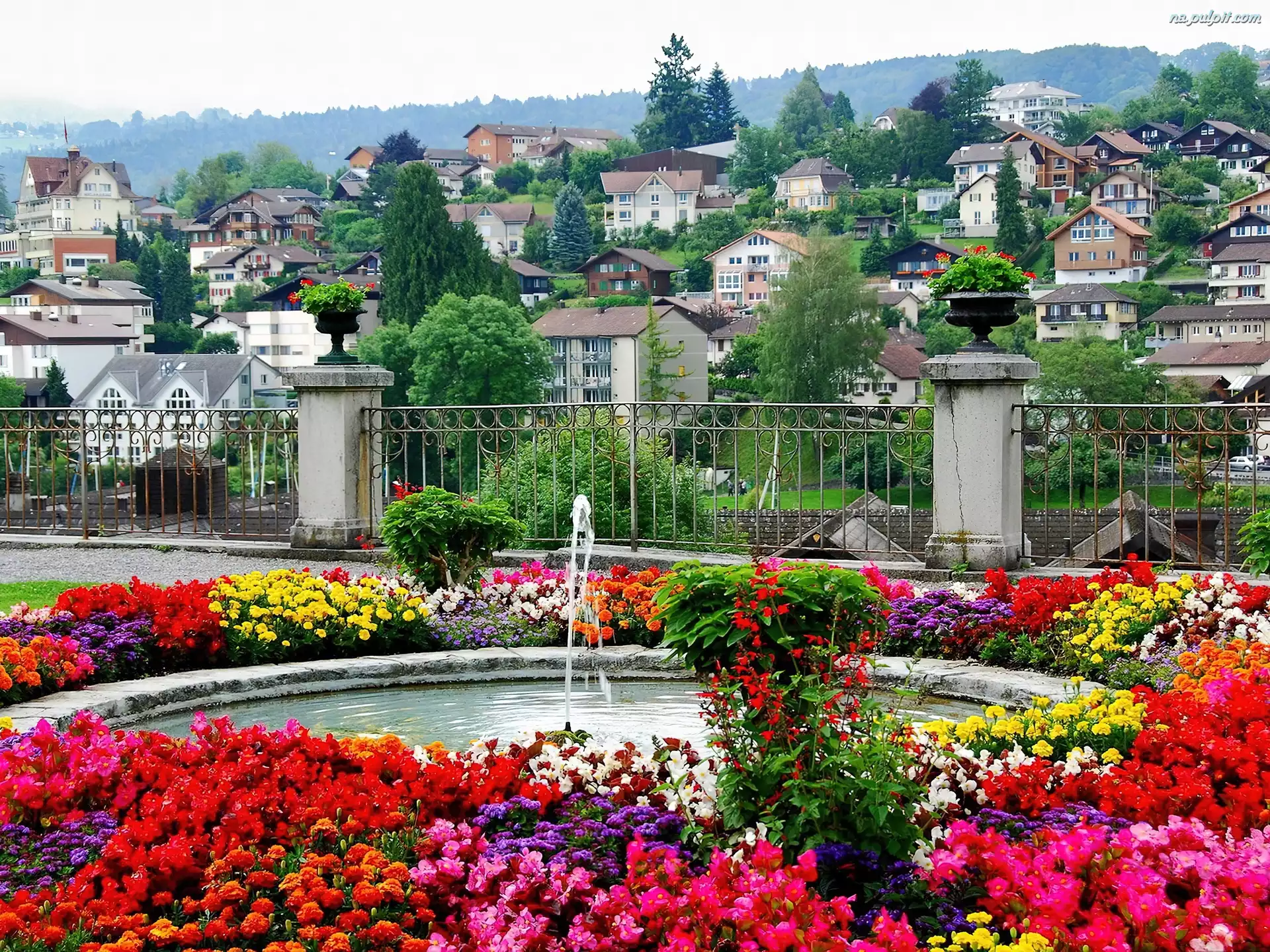 Miejscowość, Otoczona, Fontanna, Park, Kwiatami
