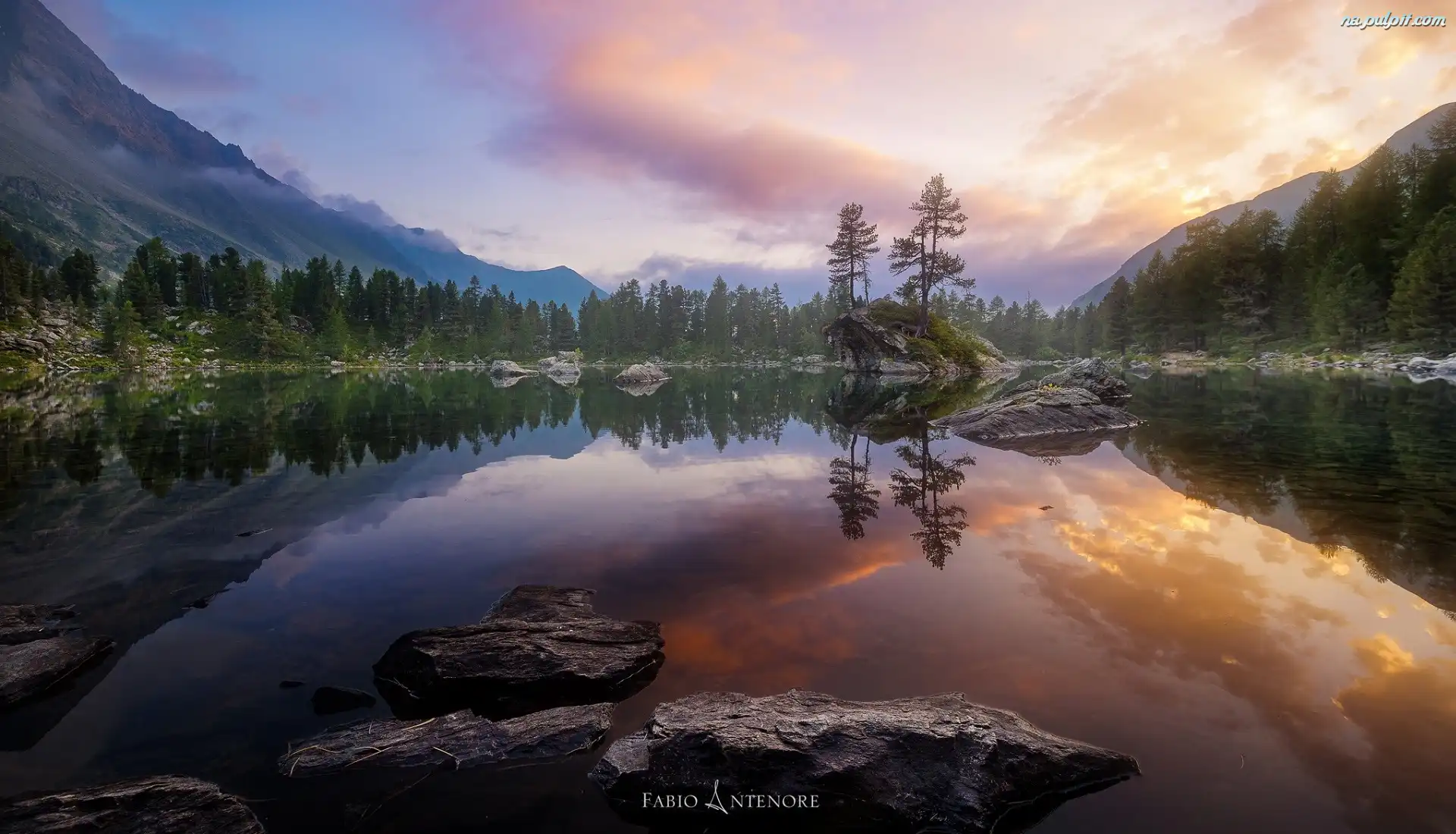 Miejscowość Poschiavo, Jezioro Saoseo, Góry, Lasy, Kanton Gryzonia, Szwajcaria, Drzewa, Zachód słońca, Kamienie Na Pulpit |