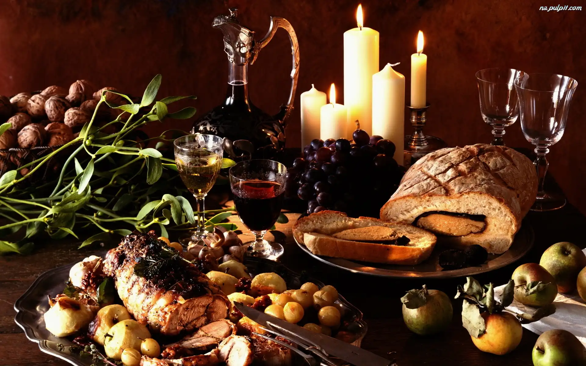 Orzechy, Mięso, Świece, Jabłka, Ziemniaczki, Pieczone, Wino Na Pulpit