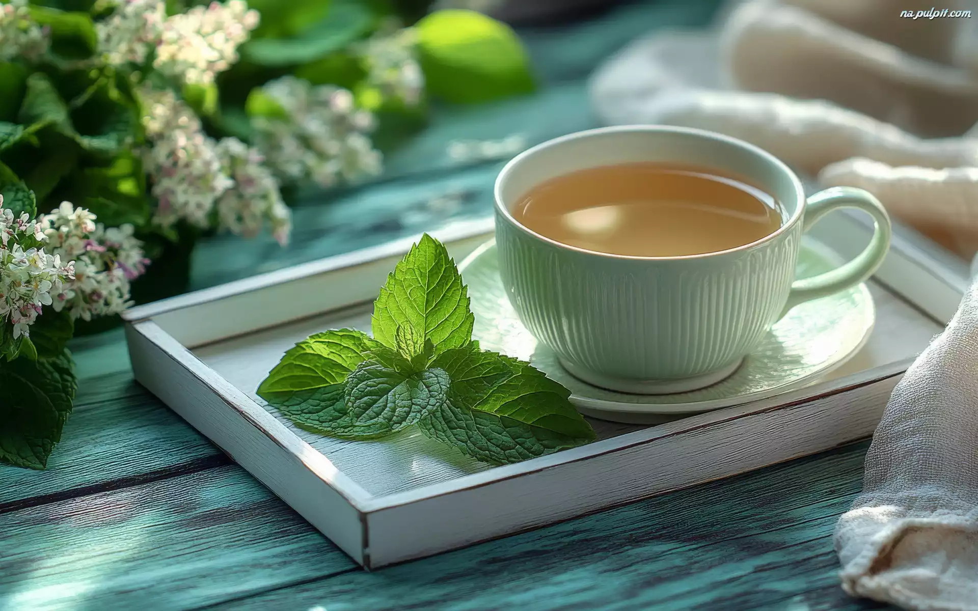 Białe, Taca, Kwiaty, Filiżanka, Deski, Tkanina, Herbata, Mięta Na Pulpit
