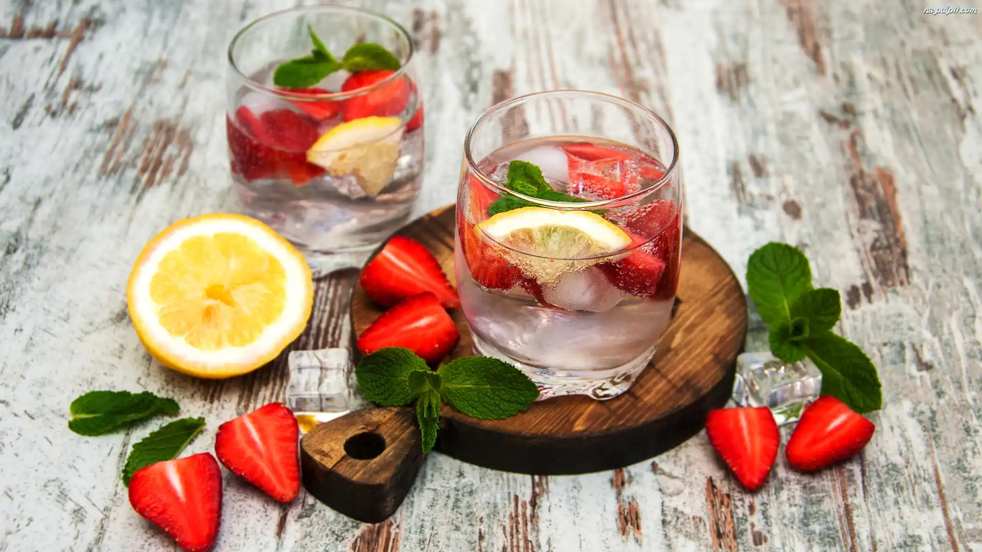 Kostki, Woda, Szklanka, Cytryna, Lodu, Deska, Truskawki, Napój, Mięta Na Pulpit
