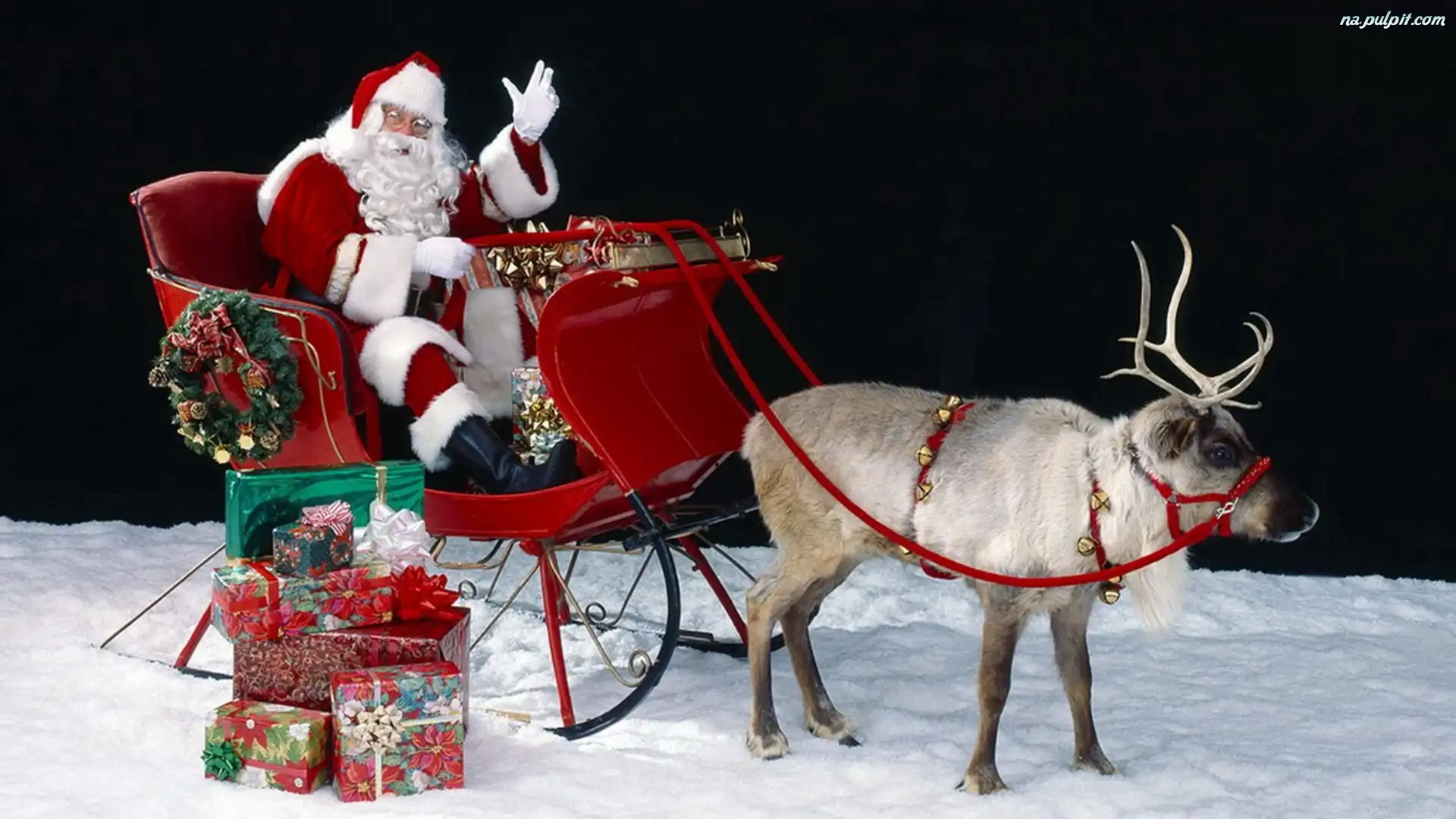 Śnieg, Sanie, Mikołaj, Renifer Na Pulpit