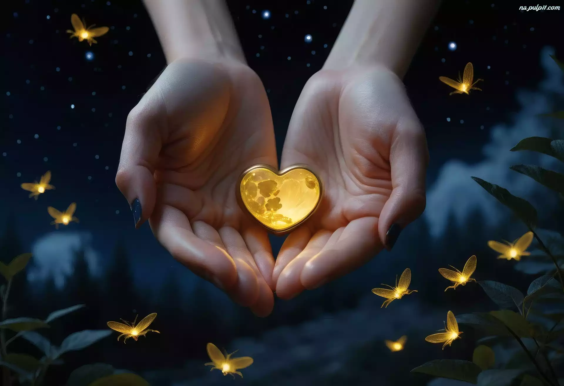Uczucie, Serce, Światełka, Dłonie, Blask, Gwiazdki, Motylki, Miłość
