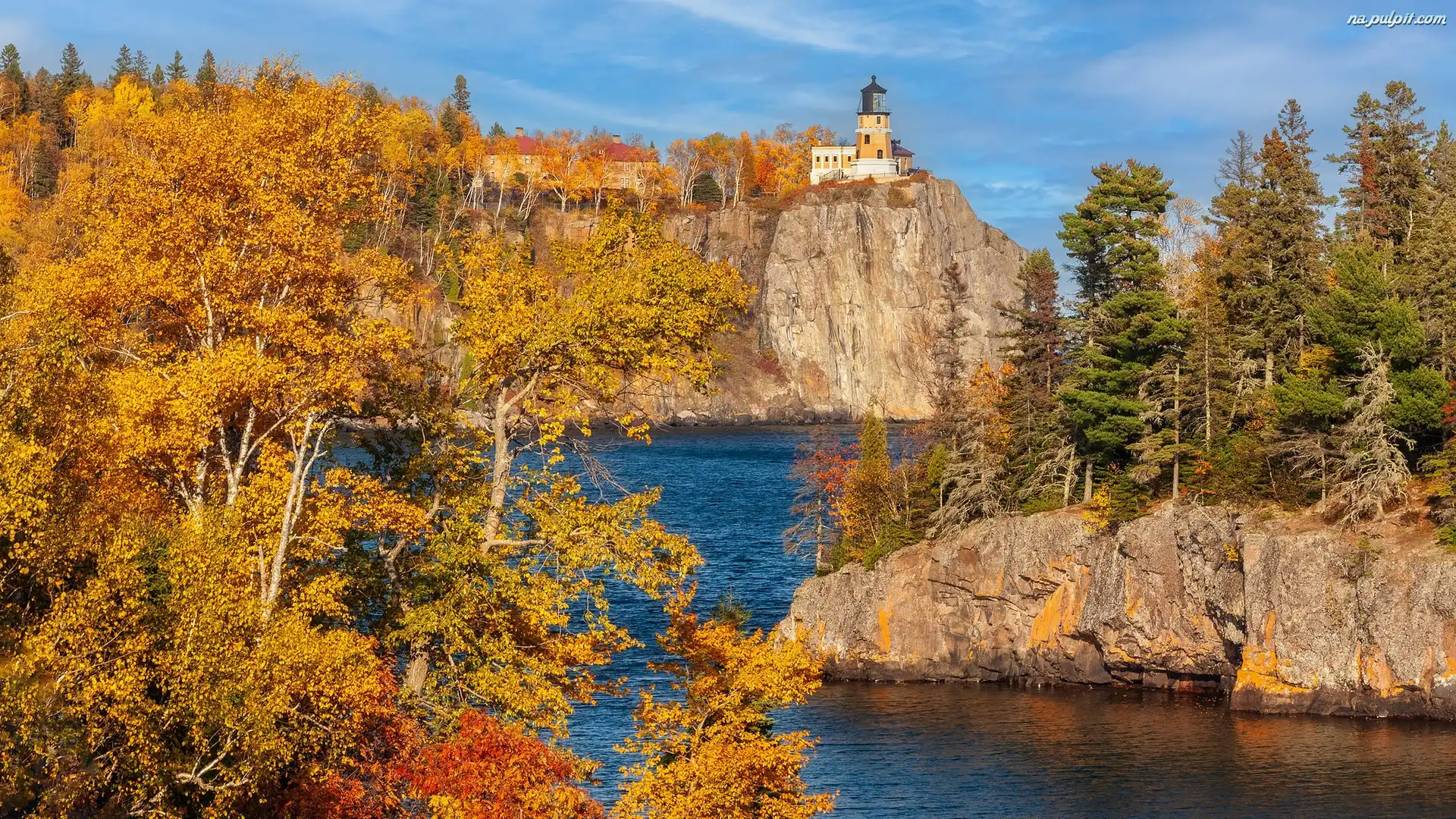 Jezioro, Split Rock Lighthouse, Lake Superior, Jesień, Stany Zjednoczone, Minnesota, Latarnia, Skały Na Pulpit |