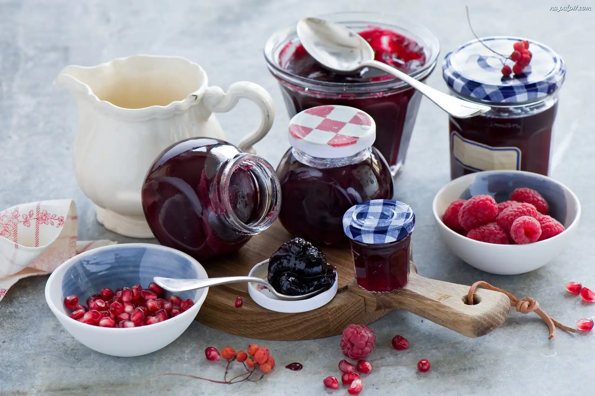 Słoiki, Dżem, Granatu, Pestki, Łyżeczki, Miseczki, Owoce, Deska, Ścierka, Dzbanek, Przetwory, Maliny Na Pulpit |