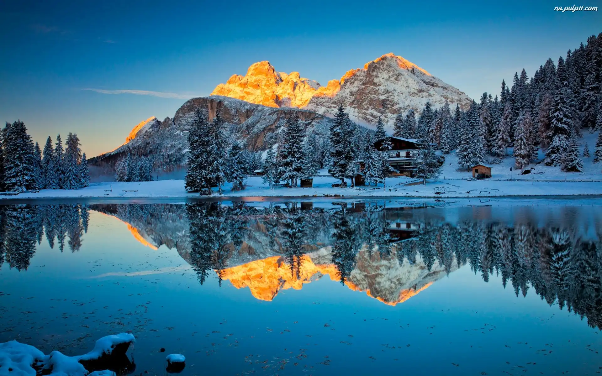 Ośnieżone, Misurina, Włochy, Świerki, Odbicie, Góry, Jezioro, Domek Na Pulpit