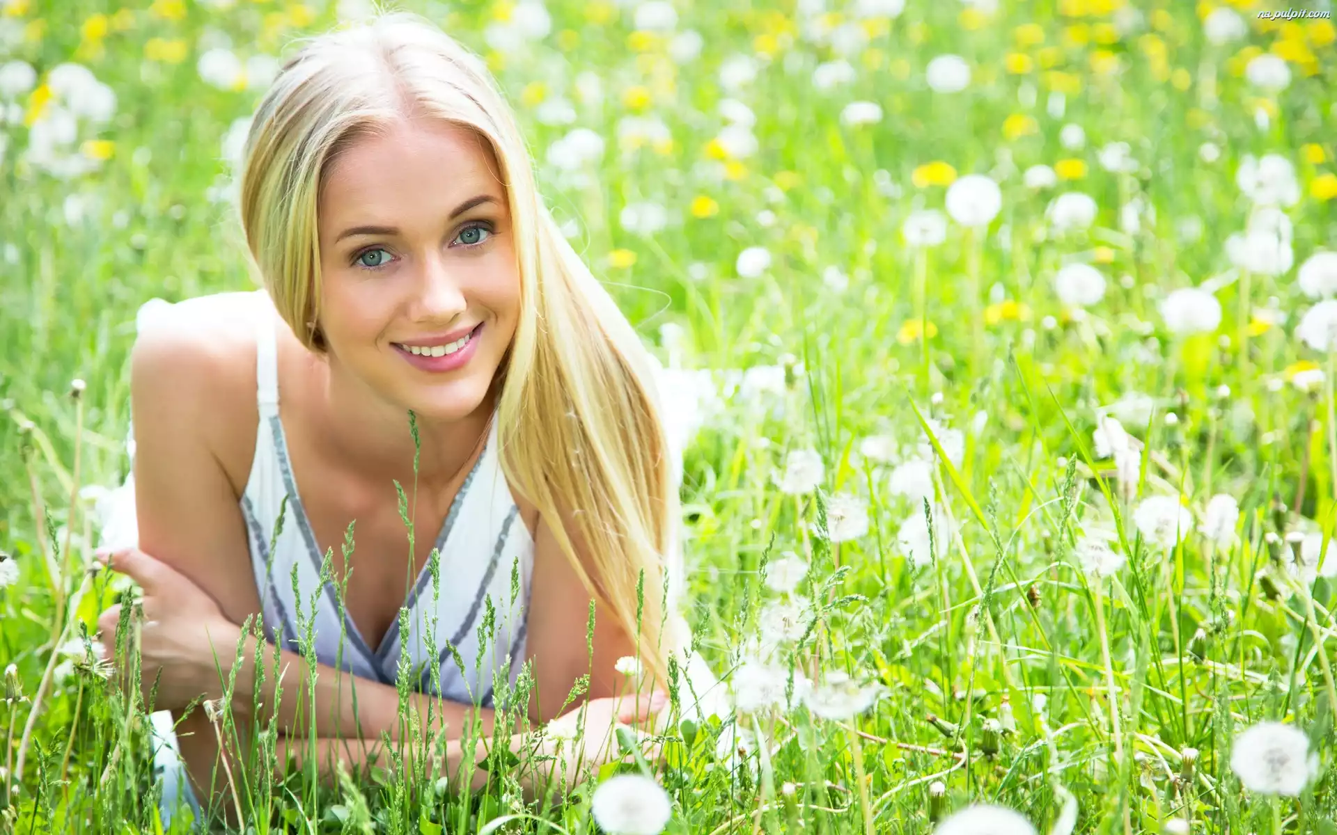 Mlecze, Blondynka, Uśmiechnięta, Łąka Na Pulpit