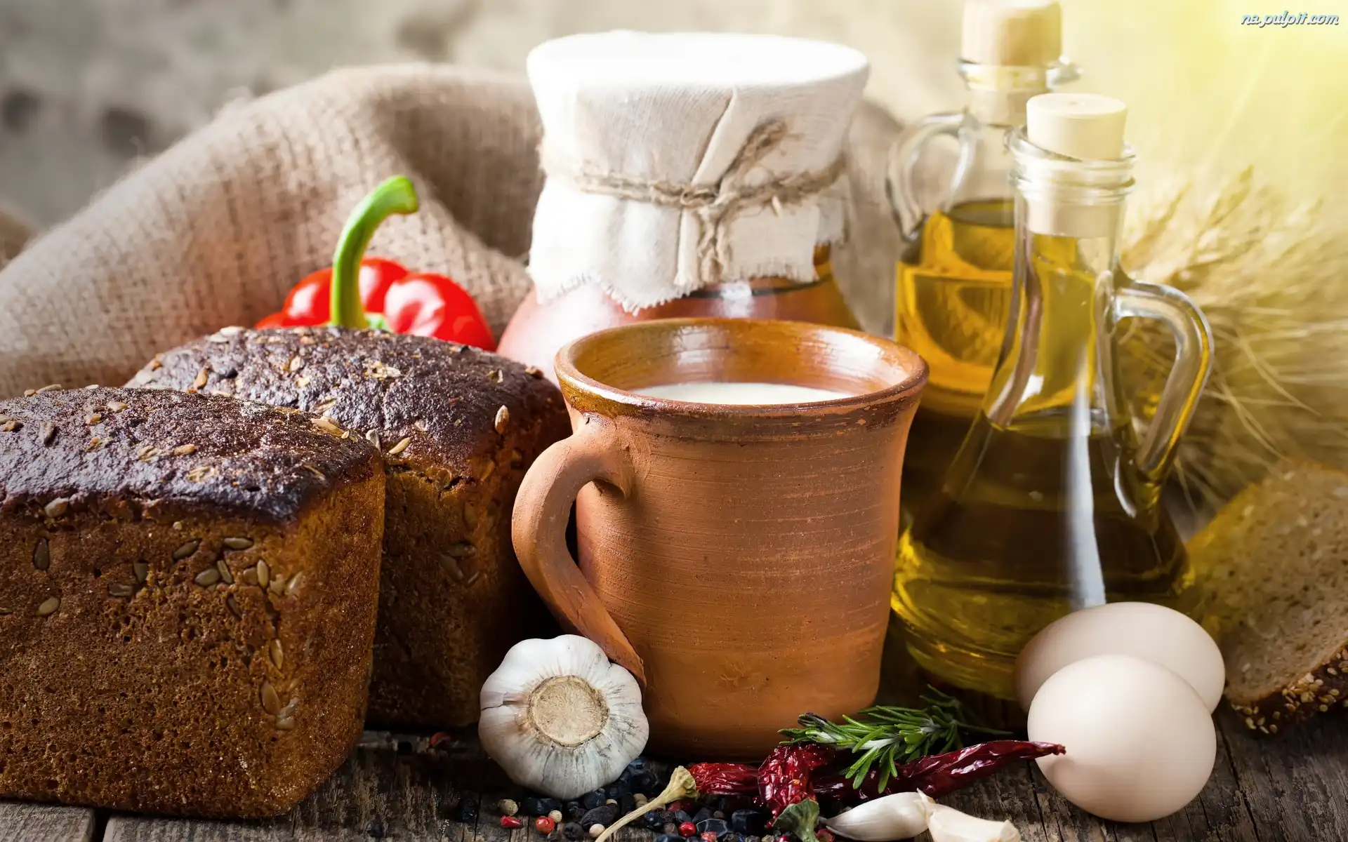 Mleko, Czosnek, Kompozycja, Olej, Chleb, Jajka Na Pulpit