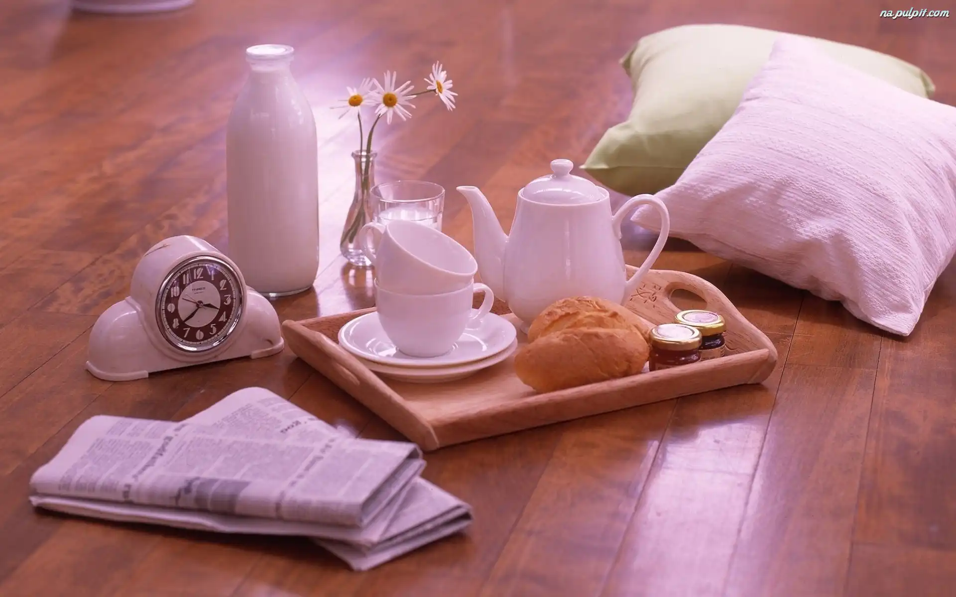 Mleko, Biała, Porcelana, Budzik, Poduszki, Śniadanko