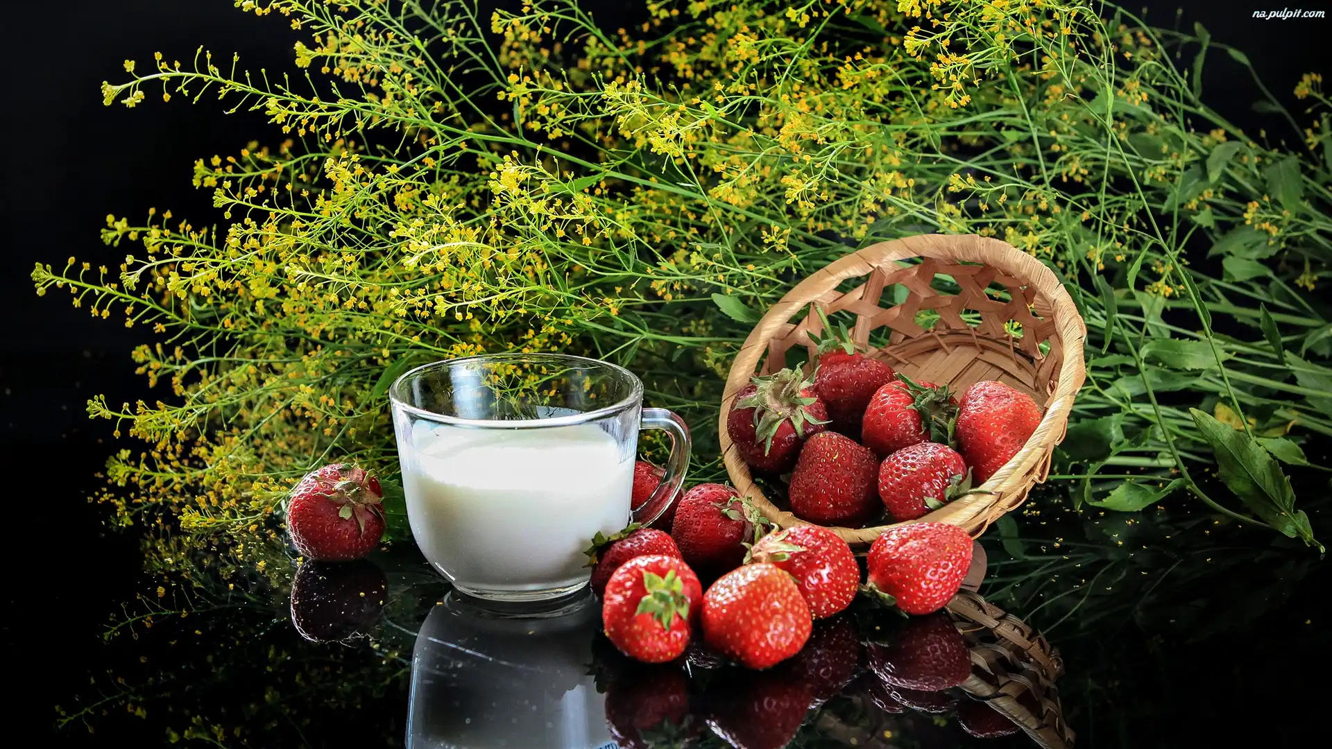 Mleko, Kwiatki, Kompozycja, Filiżanka, Truskawki, Koszyczek Na Pulpit
