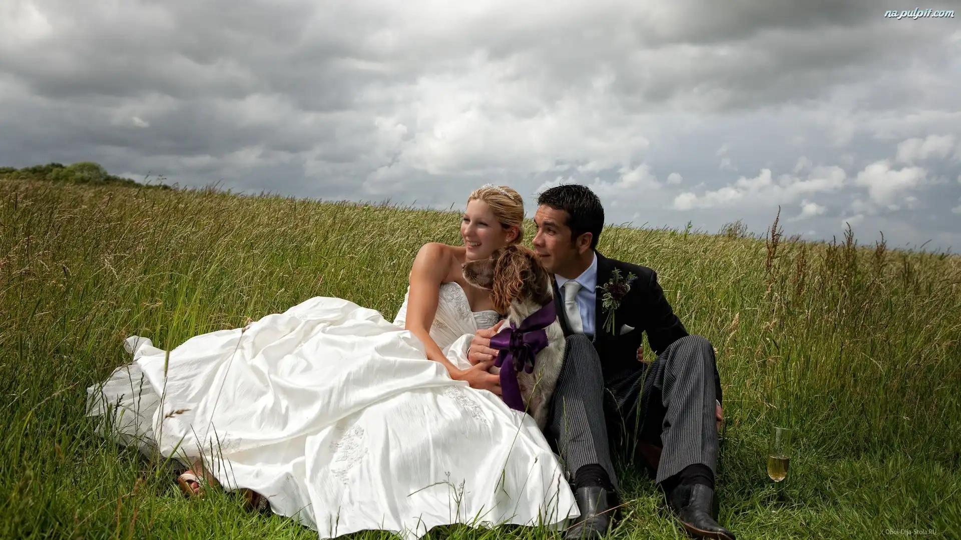 Suknia, Młoda, Biała, Lampka, Łąka, Para, Szampan Na Pulpit