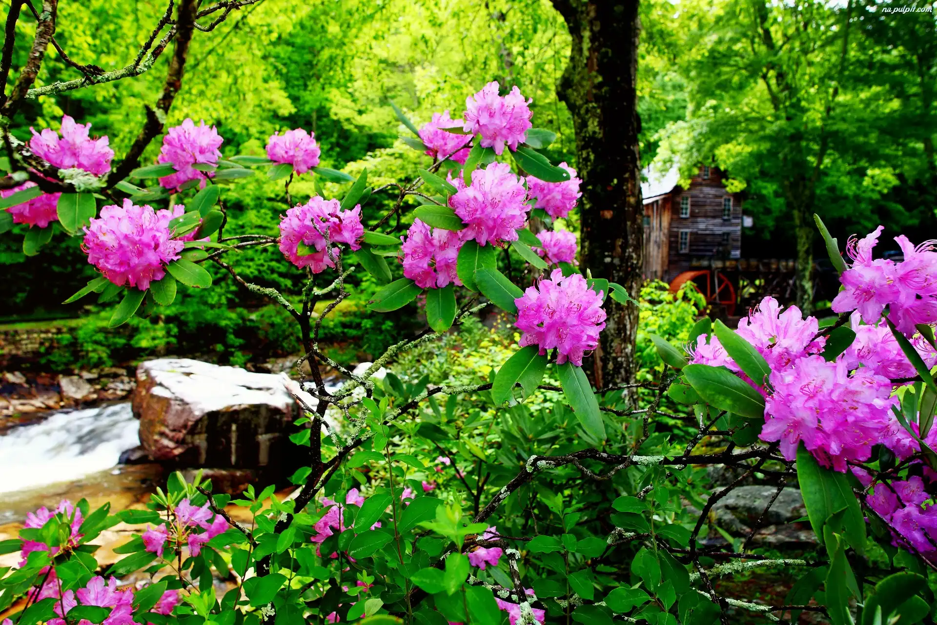 Młyn, Kwitnące, Rododendrony, Wodny, Las, Strumyk