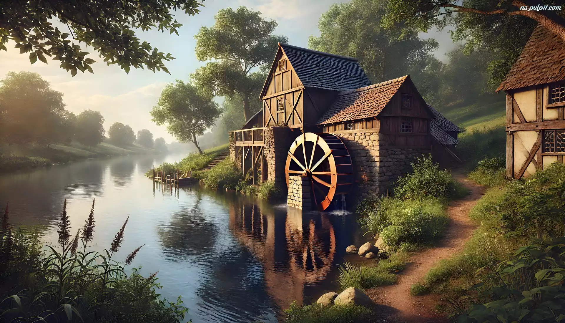 Rzeka, Młyn wodny, Drzewa, Grafika Na Pulpit