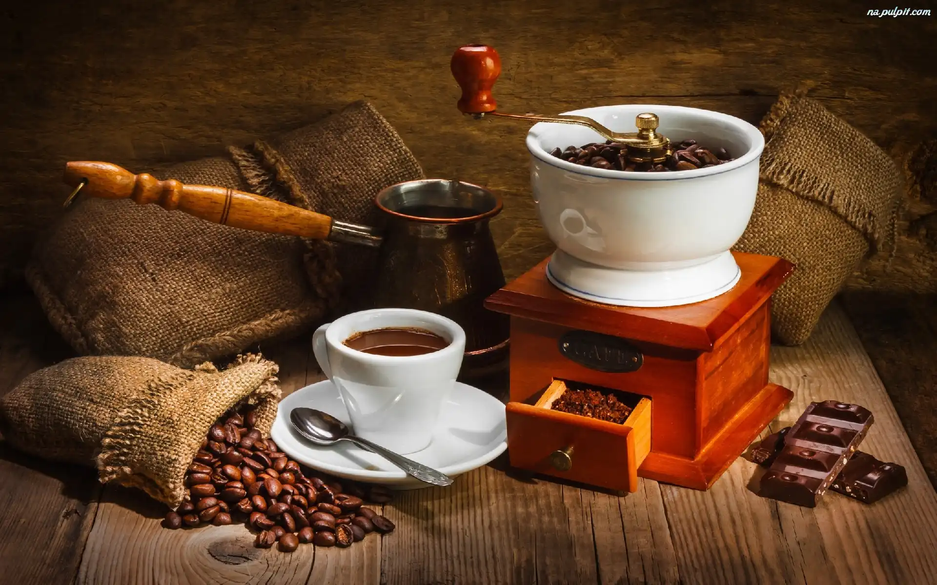 Kawy, Młynek, Zaparzonej, Kawy, Ziarna, Woreczki, Filiżanka Na Pulpit