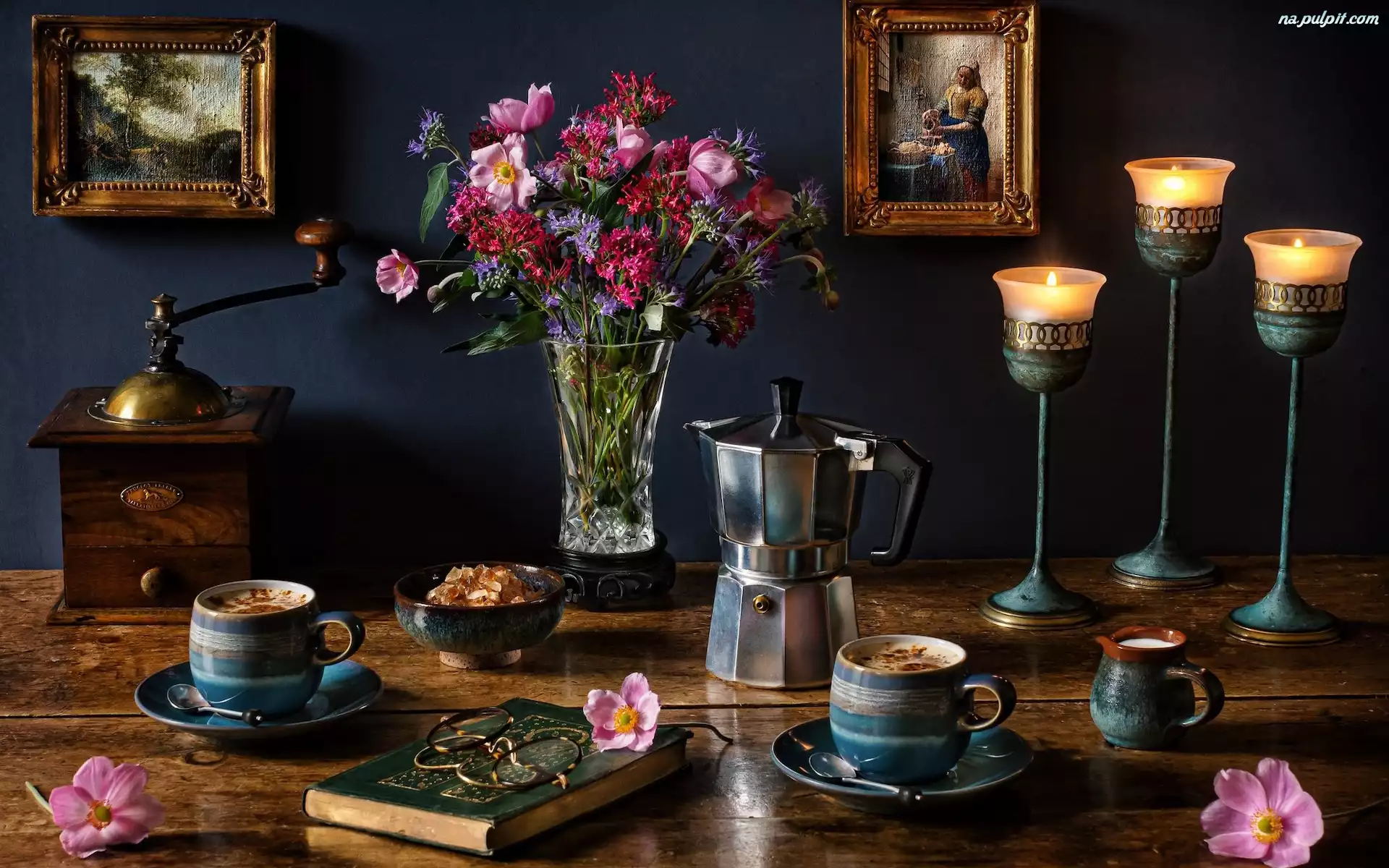 Młynek, Serwis Kawowy, Obrazy, Kompozycja, Bukiet kwiatów, Świeczniki, Książka