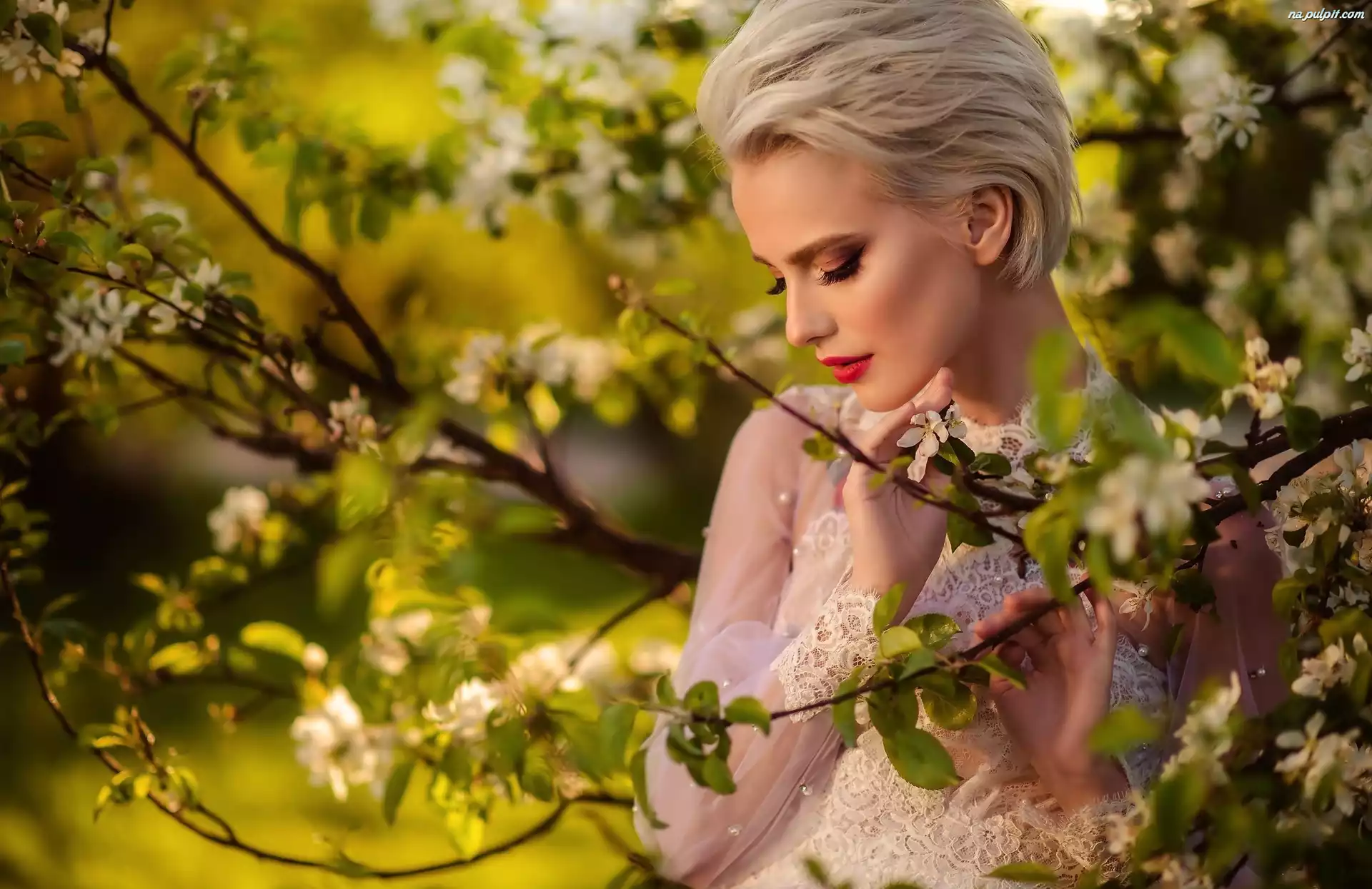 Wiosna, Modelka, Park, Drzewa, KwitnÄ…ce, Blondynka, Rzeka Na Pulpit