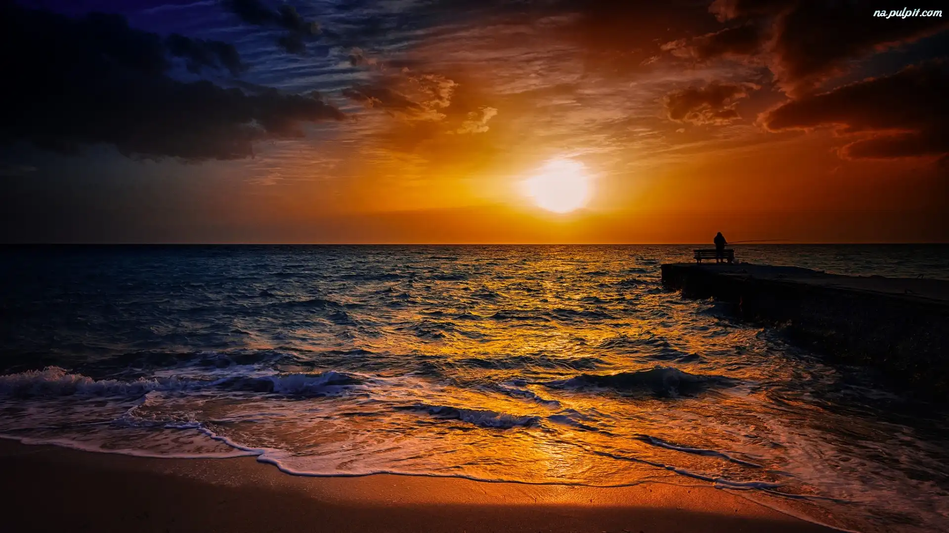 Molo, Zachód, Słońca, Wędkarz, Morze, Chmury Na Pulpit