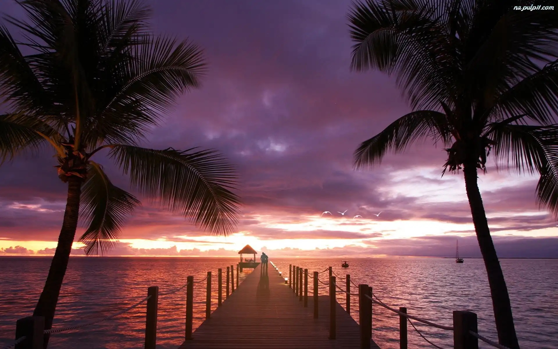 Molo, Słońca, Zachód, Morze, Palmy Na Pulpit