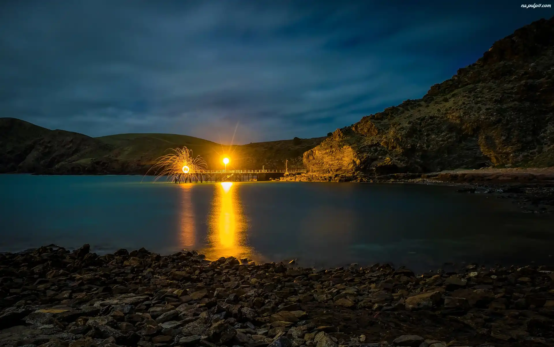 Światła, Second Valley, Noc, Kamienie, Morze, Australia, Molo