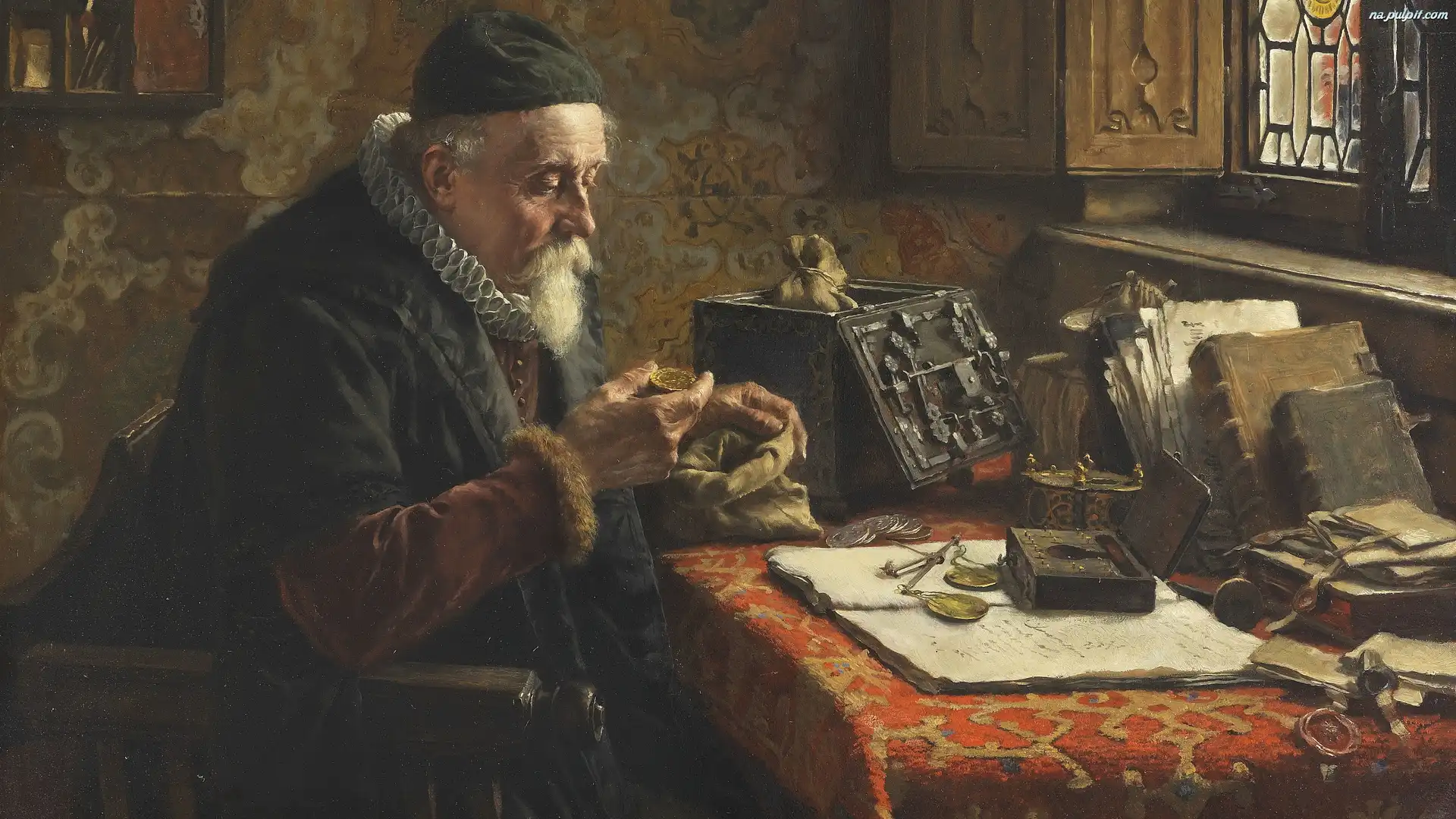 Książki, Obraz, Max Gaisser, Mężczyzna, Stół, Okno, Worek, Malarstwo, Monety Na Pulpit