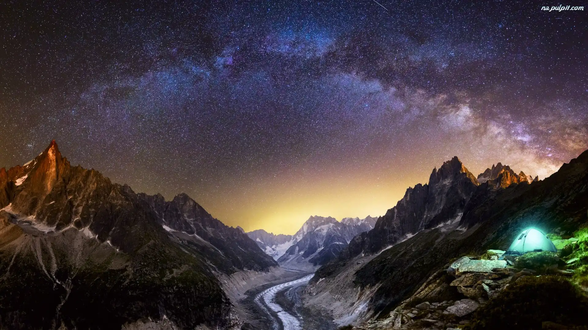 Noc, Chamonix-Mont-Blanc, Góry, Namiot, Droga Mleczna, Niebo, Francja, Gwiazdy Na Pulpit