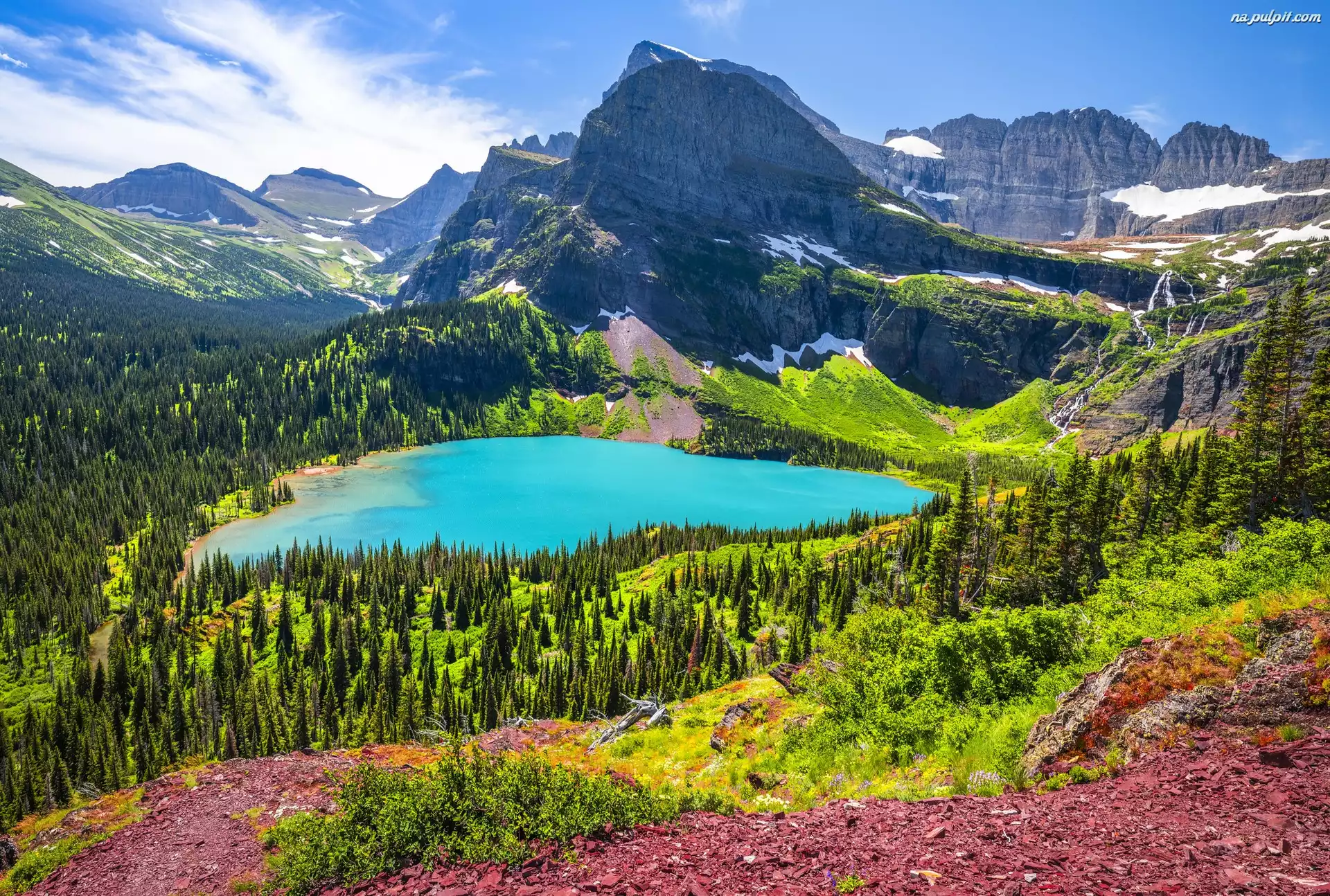 Lasy, Grinnell Lake, Niebo, Park Narodowy Glacier, Stany Zjednoczone, Montana, Jezioro, Góry Na Pulpit |