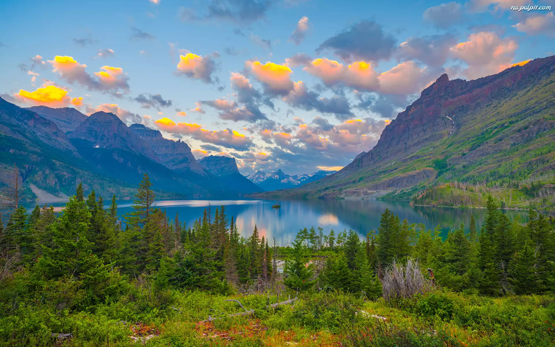 Kolorowe, Chmury, Stan Montana, Jezioro, Drzewa, Park Narodowy Glacier, Stany Zjednoczone, Niebo, Góry Na Pulpit |