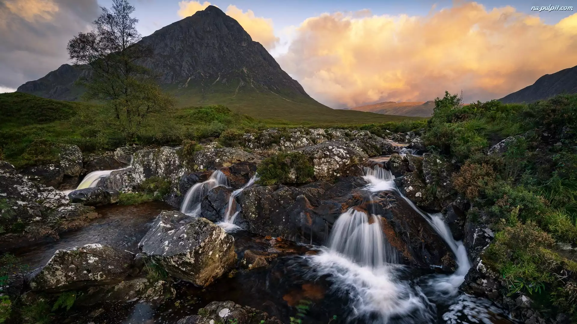 Chmury, Szczyt Buachaille Etive Mor, Rzeka, River Coupall, Region Highland, Szkocja, Kamienie, Góra, Roślinność Na Pulpit |