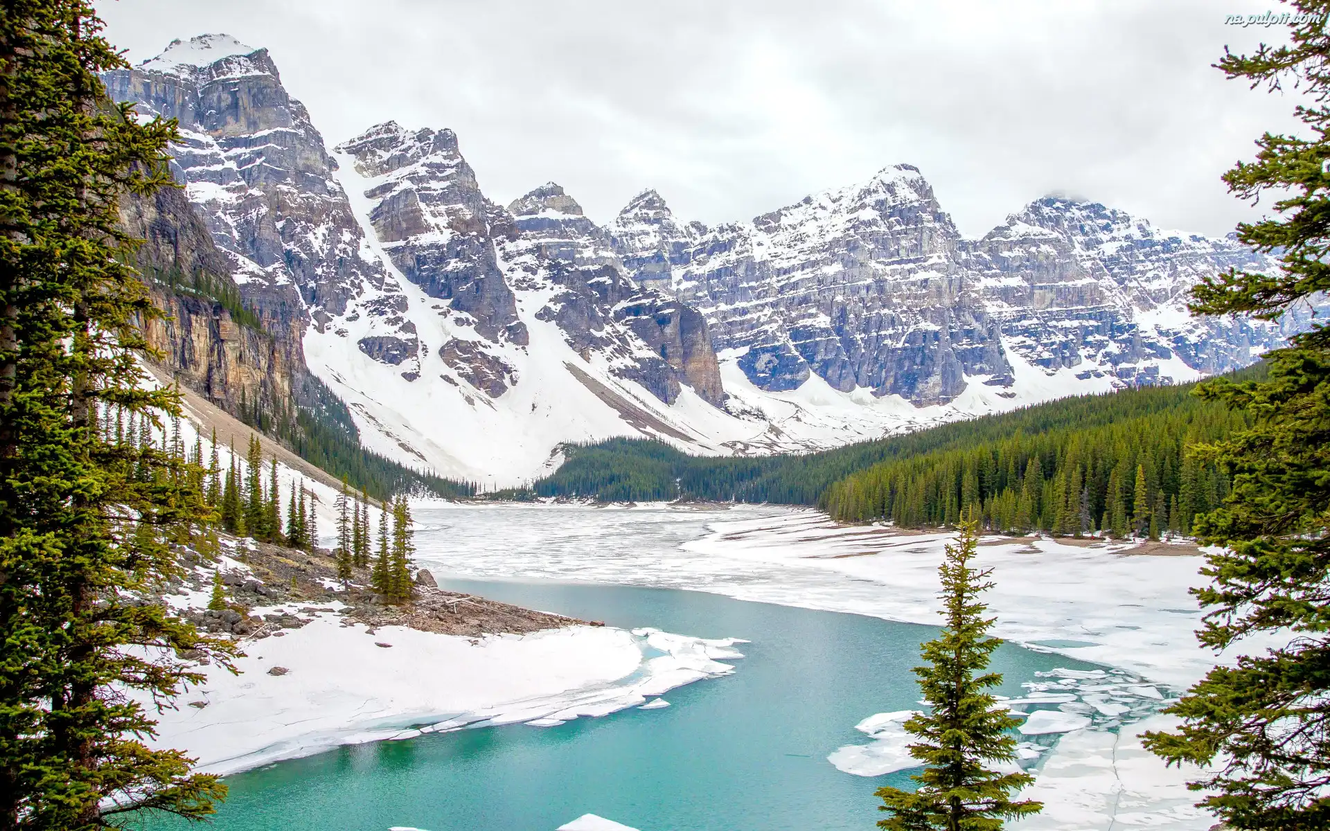 Śnieg, Zima, Jezioro, Moraine Lake, Alberta, Kanada, Góry Skaliste, Park Narodowy Banff, Drzewa Na Pulpit |