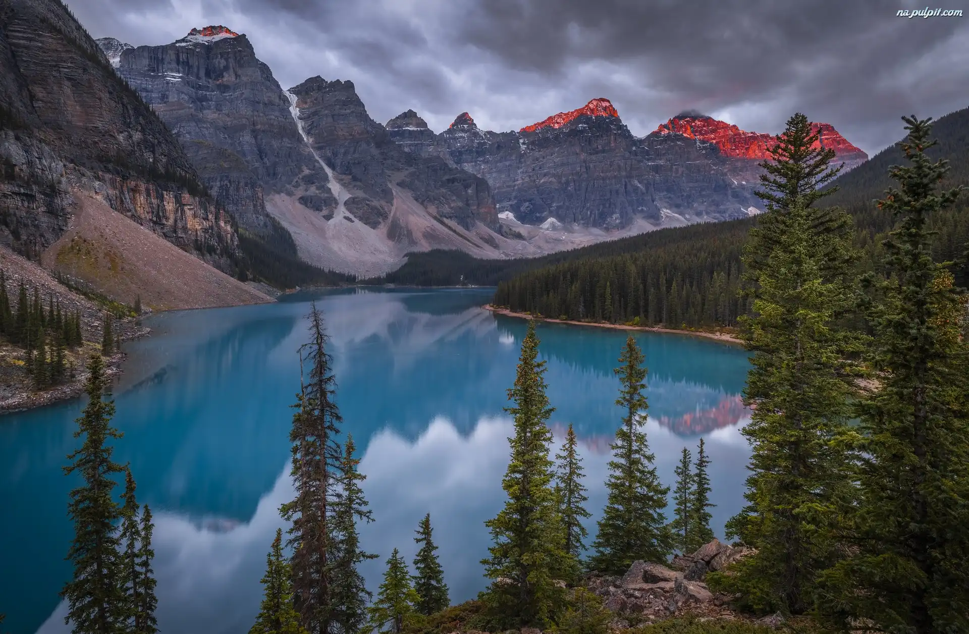 Chmury, Las, Park Narodowy Banff, Jezioro Moraine, Kanada, Odbicie, Góry, Drzewa Na Pulpit