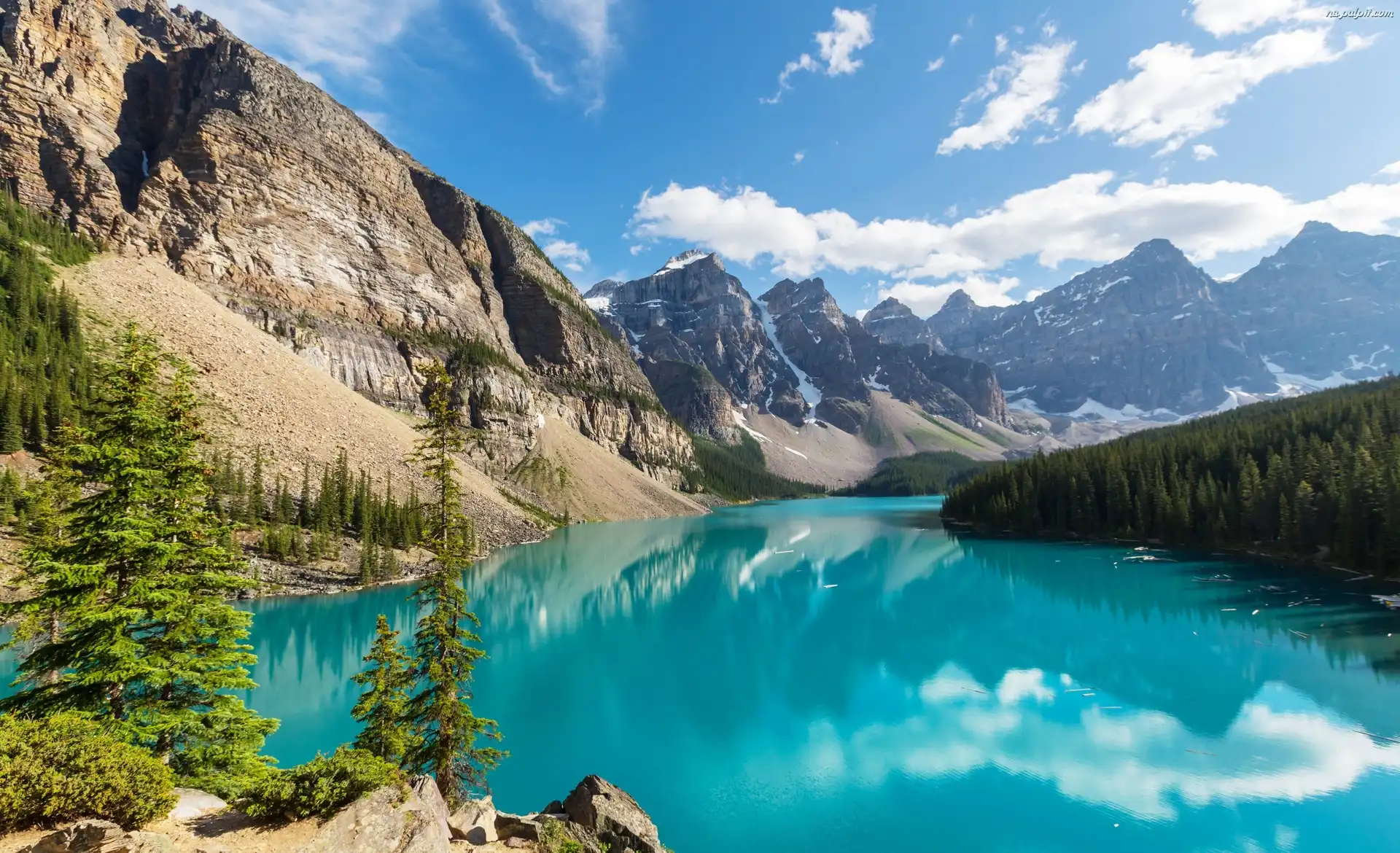 Prowincja Alberta, Drzewa, Chmury, Park Narodowy Banff, Kanada, Jezioro Moraine Na Pulpit