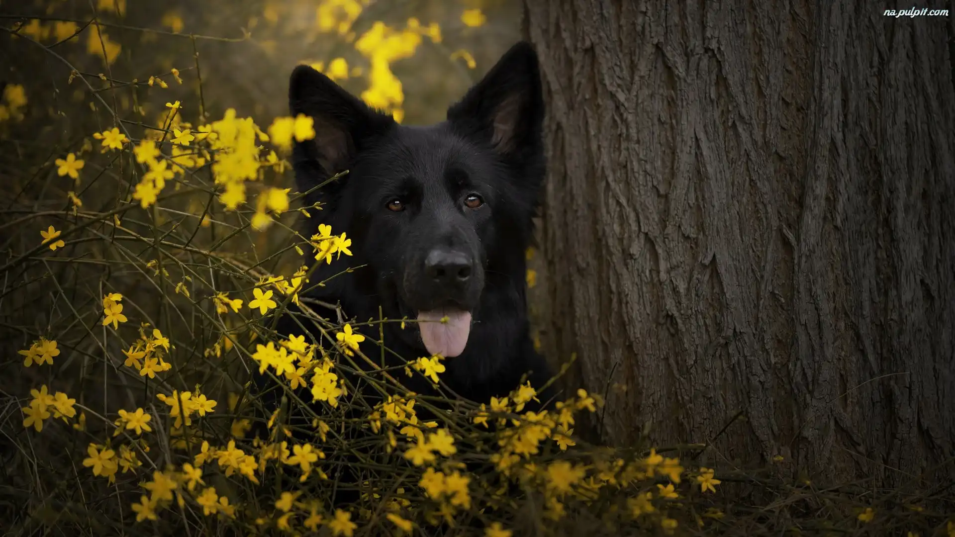 Kwiaty, Mordka, Czarny owczarek niemiecki, Pies, Drzewo Na Pulpit