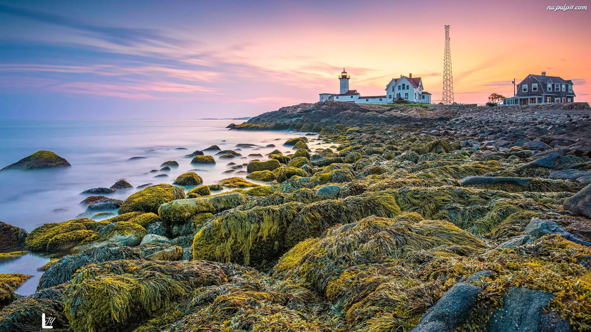 Skały, Wschód słońca, Stan Massachusetts, Cape Cod Bay, Morze, Zatoka, Stany Zjednoczone, Nobska Point Light, Latarnia morska Na Pulpit |