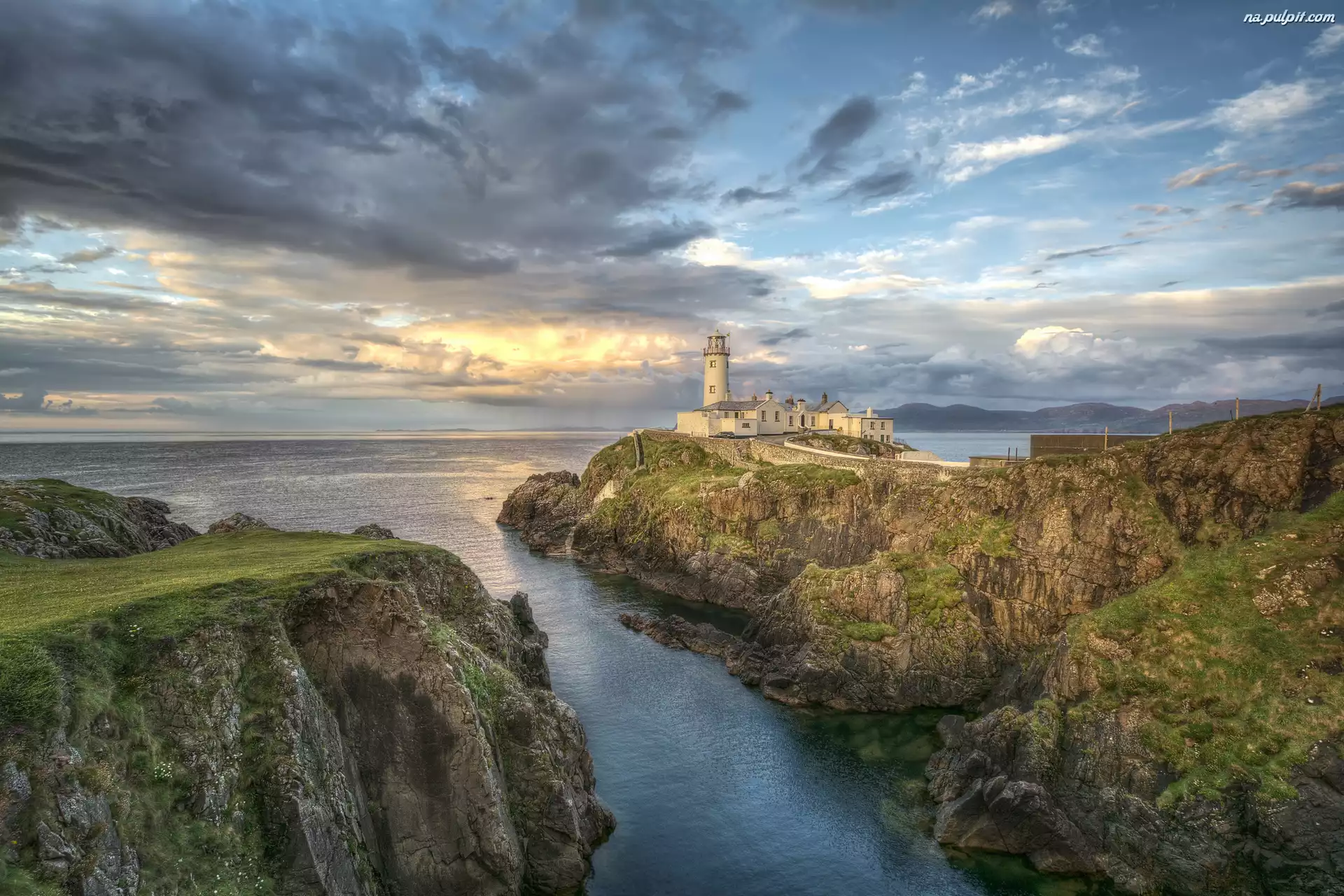Turystyczna, Latarnia morska, Fanad Head Lighthouse, Skały, Chmury, Irlandia, Morze, Atrakcja Na Pulpit |